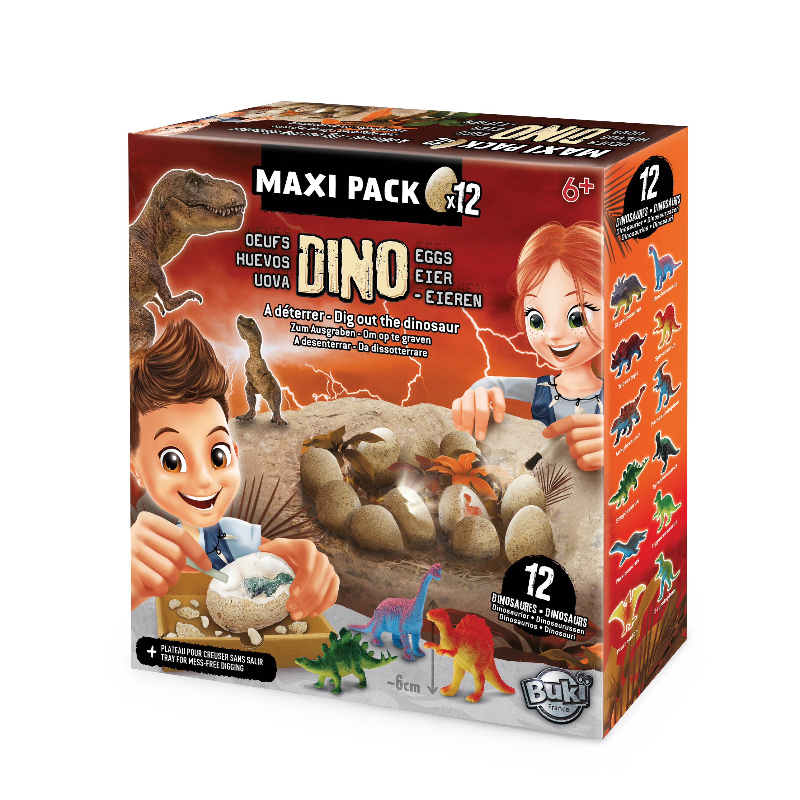 Un coffret avec 12 œufs à creuser pour déterrer 12 dinosaures différents dont le T-Rex, le Brachiosaure, le Tricératops, le Ptéranodon ou le Spinosaure…