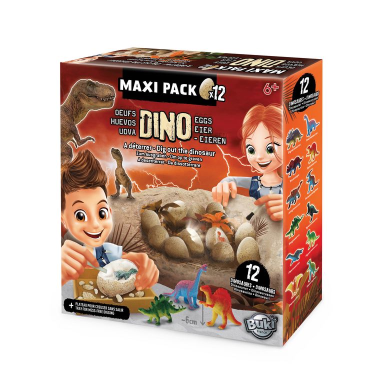 Un coffret avec 12 ?ufs à creuser pour déterrer 12 dinosaures différents dont le T-Rex, le Brachiosaure, le Tricératops, le Ptéranodon ou le Spinosaure?. Décore ta chambre avec le poster. Inclus : les outils de fouille et un plateau pour creuser sans salir. Dès 6 ans.