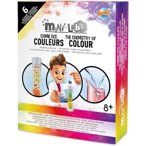 Avec ce coffret Mini lab Chimie Couleurs, votre enfant se transforme en petit chimiste pour jouer avec les couleurs. Les colorants, pastilles colorées et la poudre de chou rouge lui permettent de réaliser six expériences au cours desquelles il va changer, mélanger ou encore superposer les couleurs !