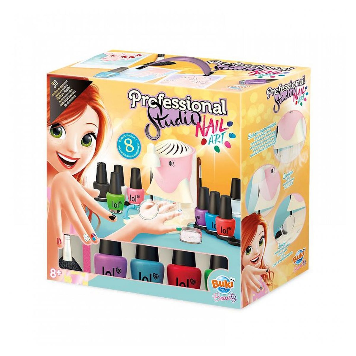 Livré avec : 8 vernis 2 limes à ongles 1 outil à pois 15 repousse-cuticules 1 pinceau éventail 1 pinceau fin 1 pot de paillettes 3 rouleaux adhésifs 2 feuilles de stickers 30 fiches recto verso Type : Jeu éducatif 8 - 10 ans : Oui Livre musical : Non