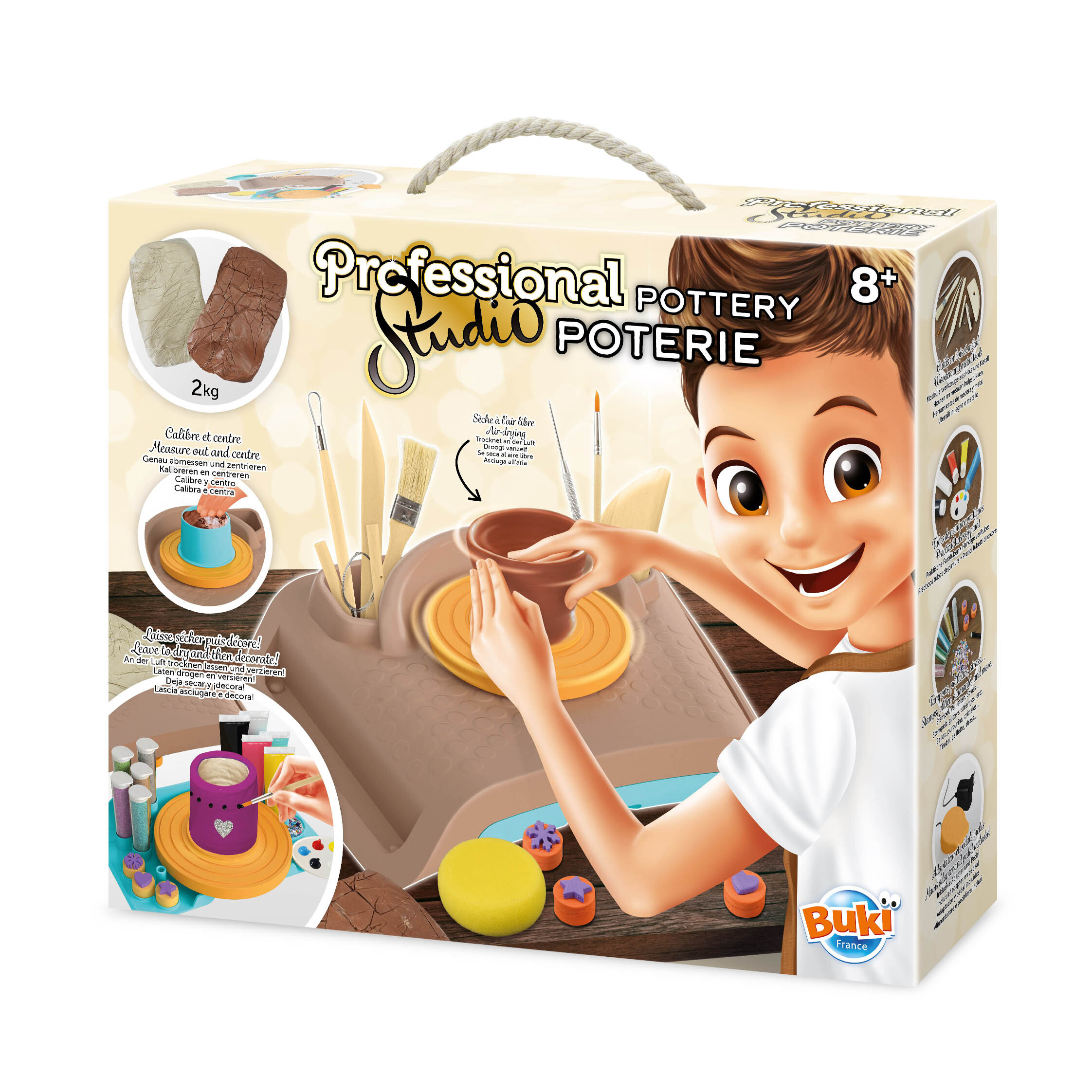 Le Studio professionnel de Poterie BUKI propose une expérience complète et immersive dans le monde de la poterie pour les enfants à partir de 8 ans. Ce kit sophistiqué transforme la table de jeu en un véritable atelier de potier, équipé de tout le nécessaire pour façonner, décorer et personnaliser des œuvres en argile.
