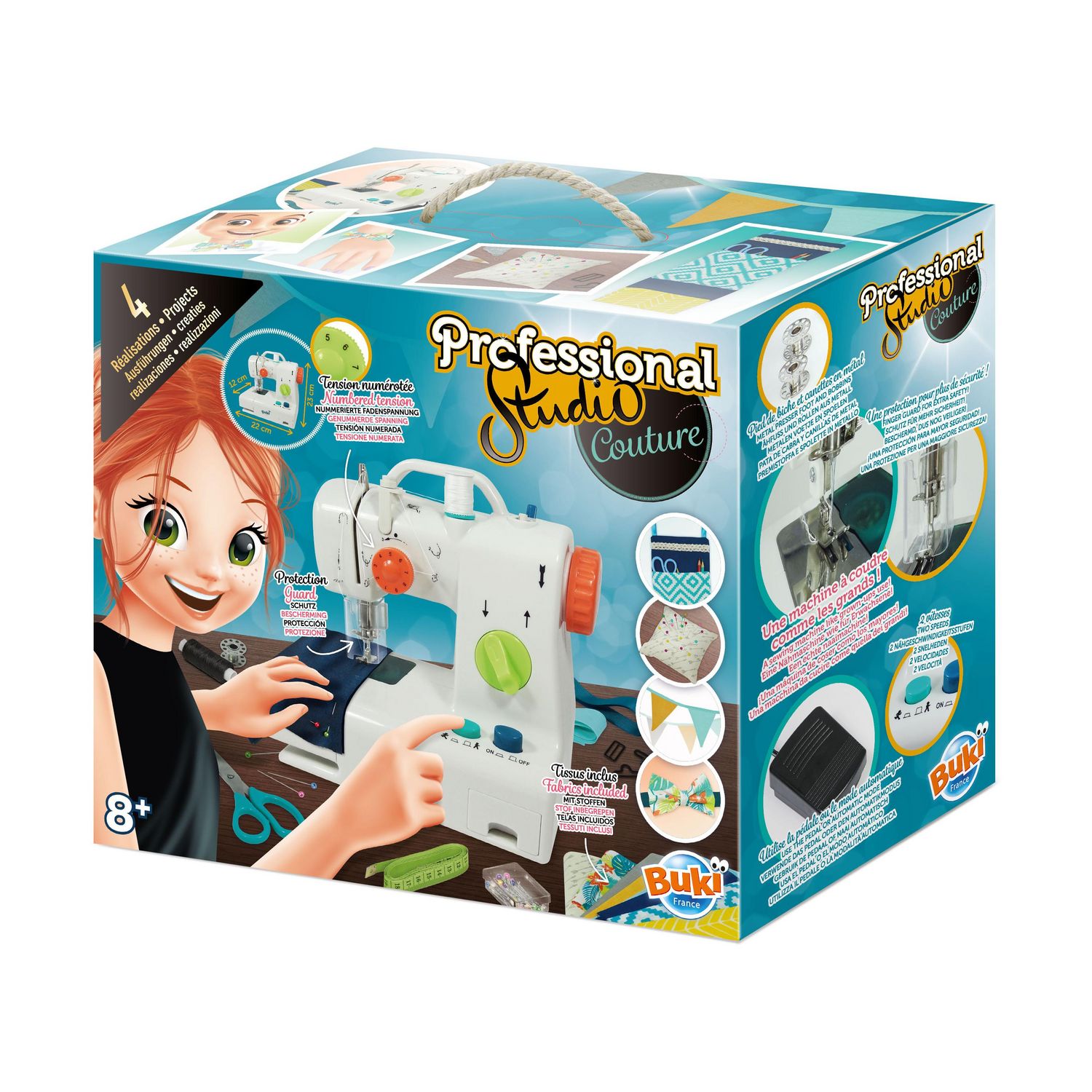 De nombreux accessoires dont des canettes en métal et des aiguilles de rechange pour la machine sont fournis. Les réalisations et les bases de la couture sont expliquées pas à pas dans une notice illustrée agrémentée de flashcodes pour accéder à des tutoriels vidéo !