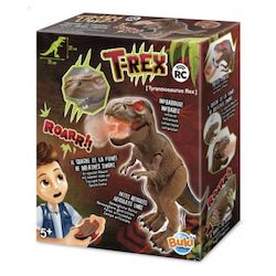 Un tyrannosaure télécommandé de 31 cm de long. Il avance avec ses pattes articulées et crache de la fumée. La télécommande a une portée de 3 mètres.