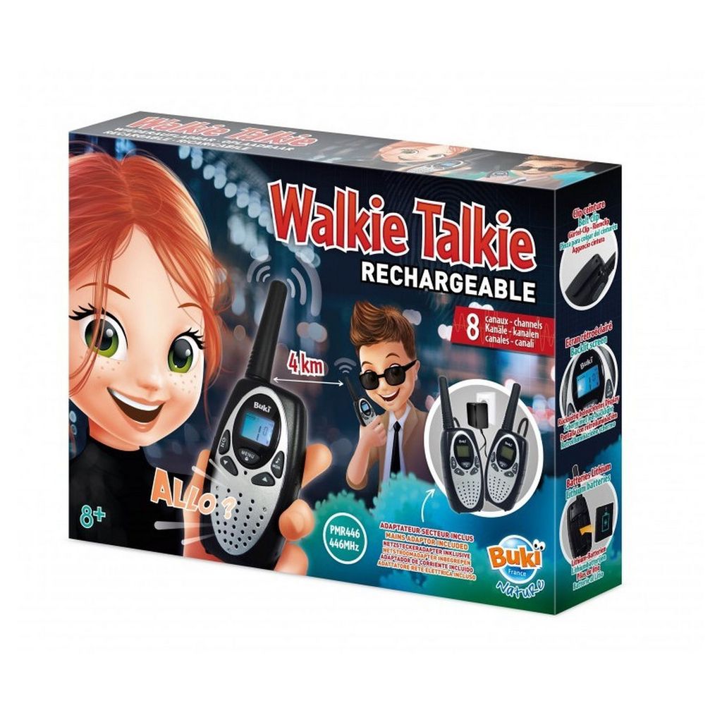 Explore le monde avec des talkies walkies rechargeables d'une portée de 4 km. Fonctionne avec des batteries lithium et un adaptateur secteur inclus. Nombreuses fonctions : 8 canaux utilisables partout, mode appel avec 10 sonneries, écran rétroéclairé..