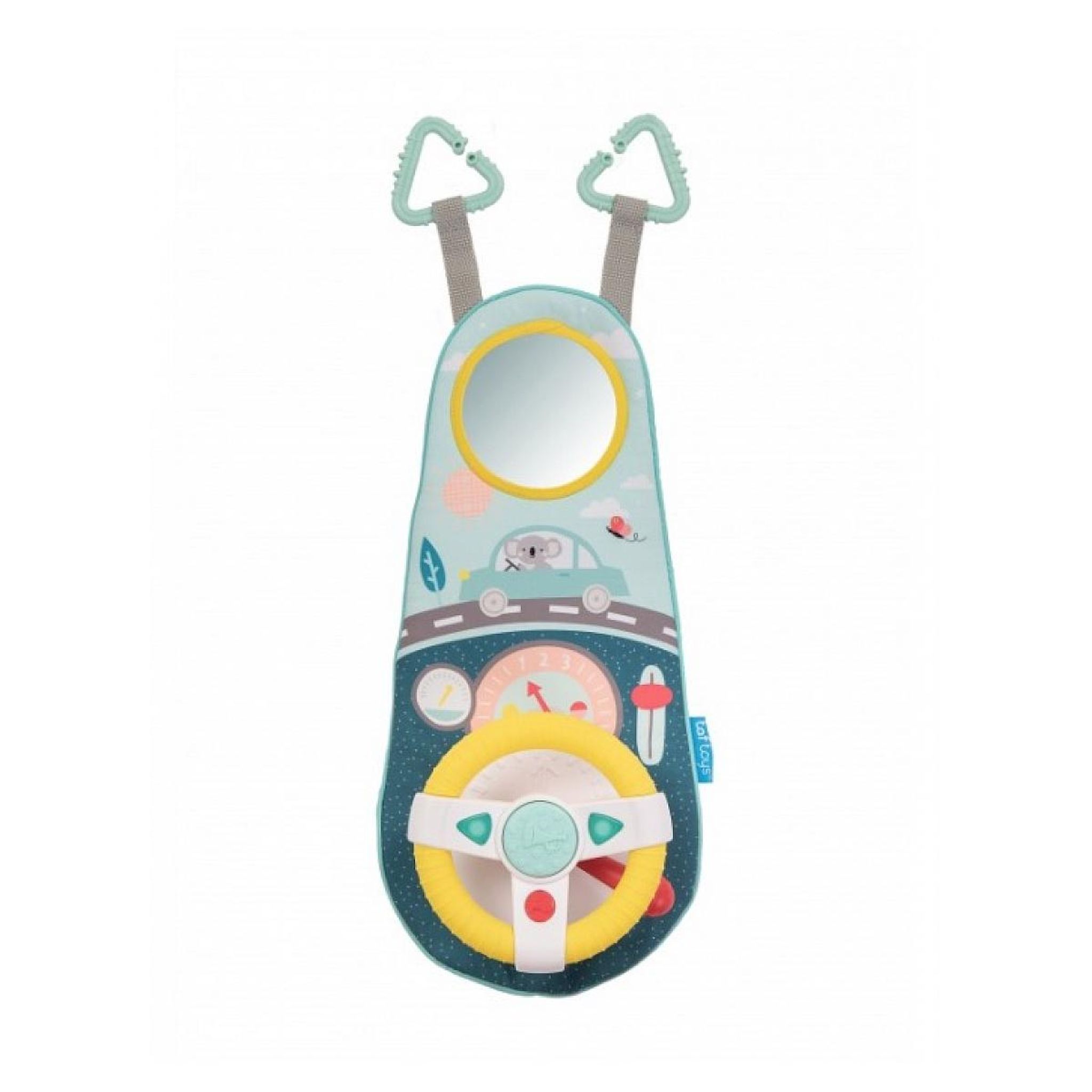 Un volant musical pour jouer pendant les trajets en voiture ! Bébé trouvera le klaxon et ses sons rigolos, le levier de vitesses, le bruit de démarrage et les boutons pour déclencher musique et lumières, un miroir. Les sangles sont réglables et permettent de fixer le volant sur la plupart des sièges