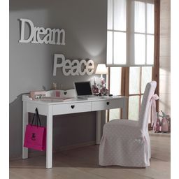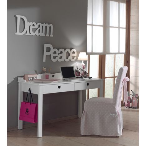 Le bureau Maude, à l'esprit romantique avec des motifs cœurs, offre un bel espace de travail mais aussi du rangement grâce à ses deux tiroirs. La matière MDF lui procure qualité et solidité. Le coloris blanc de ce bureau et la finition laqué en font un modèle intemporel et facile à associer.