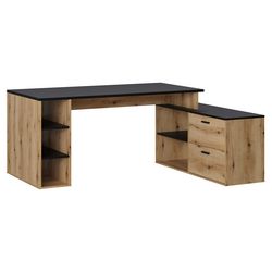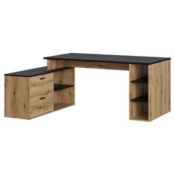 Moderne et design, le bureau d'angle ESTEBAN est fabriqué en mélamine chêne rustique et noire. Idéal pour le télétravail, il dispose de nombreux rangements avec ses niches et tiroirs.