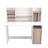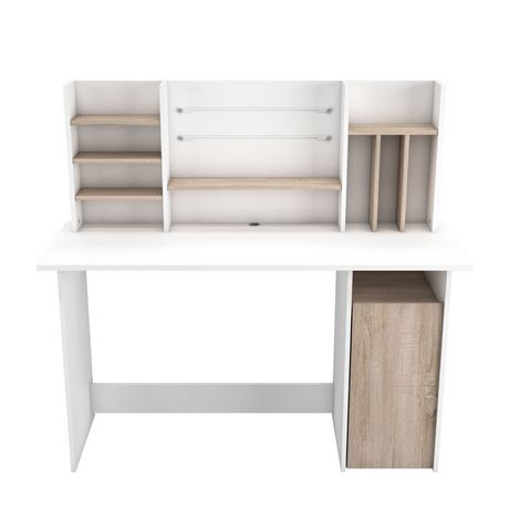 1 rayon réglable sur 3 niveaux (dimensions utiles: 30 x 39 cm). 1 niche inférieure, dimensions utiles: 30 x 17 x 40 cm. Surmeuble , 3 rayons fixes côté gauche (dimensions utiles: 30x12 cm). 1 rayon central, dimensions utiles: 59x12 cm. 1 rayon droit, dimensions utiles: 59x12 cm. 2 élastiques au centre du surmeuble pour faire tenir papiers/ photos... Plan de travail perçé pour passe-câbles.