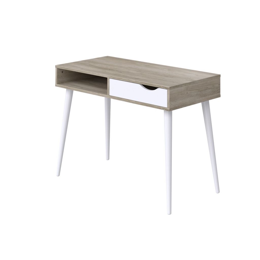 Design au style scandinave, vous allez adorer le bureau droit Yelena fabriqué en mélamine chêne et blanche avec des pieds en bois massif teintés blancs.