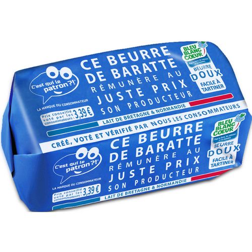 Ce beurre de baratte rémunère au juste prix son producteur; CE BEURRE A ÉTÉ CREE PAR NOUS LES CONSOMMATEURS. Il est fabriqué en France, avec du lait "C'est qui le Patron ?!" selon une méthode de barattage traditionnelle. Sa crème est maturée longtemps pour plus de saveurs. En respectant le cahier des charges Bleu-Blanc-Coeur, l'alimentation des vaches est équilibrée, ce qui rend ce beurre facile à tartiner. En l'achetant nous soutenons les éleveurs qui s'engagent à bien nourrir leurs animaux tout en respectant notre environnement*. Nous avons créé tous ensemble un beurre bon et responsable. Bravo à tous :) !;* Plus d'information : https://bleu-blanc-coeur.org/