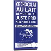 Le chocolat lait "C'est qui le Patron?!", un chocolat qui rémunère au juste prix les planteurs. Produit issu de l'agriculture conventionnelle.