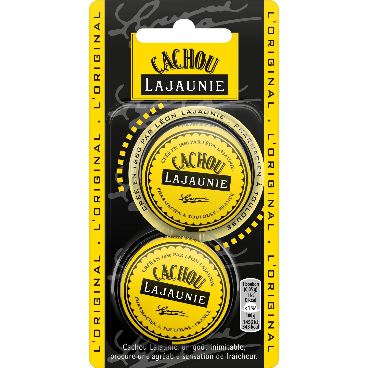 Ingrédients : Extrait de réglisse (34 %), Sucre, Amidon de maïs, Lactose (de LAIT), Poudre d'Iris, Poudre de cachou, Arôme naturel de menthe, Huiles végétales (Palme, Palmiste), Colorant (E153), Gélatine, Résine de lentisque, Agent d'enrobage (Cire de carnauba). Contient de la réglisse - les personnes souffrant d'hypertension doivent éviter toute consommation excessive.