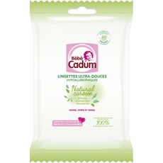 Lingettes Ultra Douces hypoallergéniques à l'huile d'amandes douces bio, dans un format pocket très pratique, pour débarbouiller le visage, le corps et les mains de bébé, sans rinçage et dans le plus grand respect. Bébé Cadum Lingettes Bébé Ultra-Douces Hypoallergéniques en format pocket x20