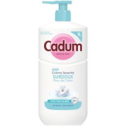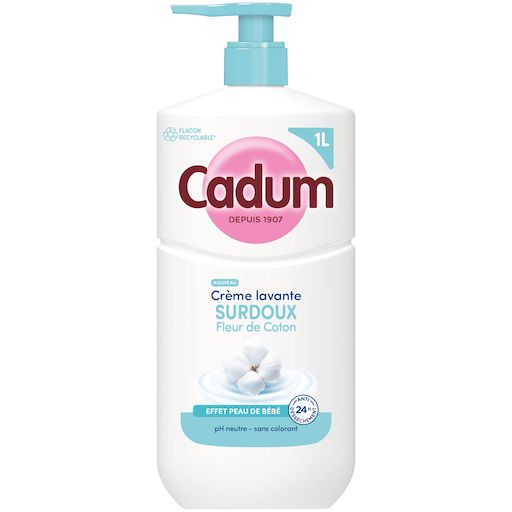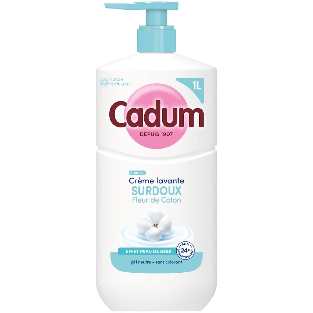 Depuis plus d’un siècle, Cadum met tout son savoir-faire au service de la douceur. Créée en 1907, la marque accompagne les familles avec des soins pensés pour respecter toutes les peaux, même les plus sensibles. Cette crème lavante au parfum Fleur de Coton s’inscrit dans cette tradition et offre un moment de confort unique au quotidien. Sa texture crème nettoie délicatement et laisse la peau douce comme celle d'un bébé. Sa formule enrichie en huile d’amande douce bio, selectionnée pour ses vertus naturellement nourisstantes, offre un soin 24h anti-dessèchement. Son parfum doux et floral parfume délicatemment la peau. Testée sous contrôle dermatologique, sa formule au pH neutre, sans savon ni colorant, respecte parfaitement l’équilibre cutané de toute la famille dès 3 ans. Et pour allier soin et responsabilité, Cadum propose désormais un flacon recyclable* et composé à 70 % de plastique recyclé**. Il est aussi plus léger : -10% de plastique par rapport à l’ancien flacon 1L. *Si jeté