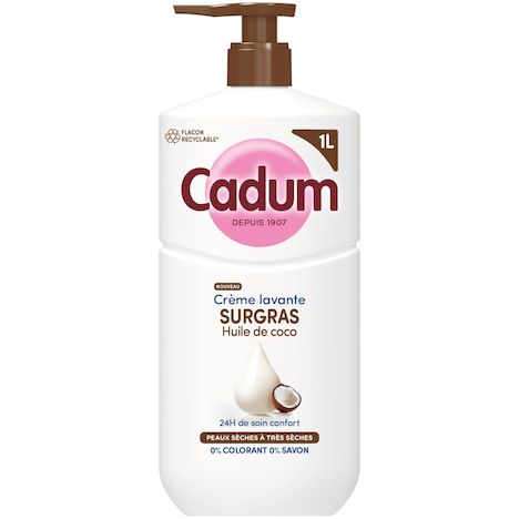 Depuis plus d’un siècle, Cadum met tout son savoir-faire au service de la douceur. Créée en 1907, la marque accompagne les familles avec des soins pensés pour respecter toutes les peaux, même les plus sensibles. Cette crème lavante surgras à l'huile de coco s’inscrit dans cette tradition et offre un moment de confort unique au quotidien. Sa texture crème nettoie délicatement et laisse la peau douce comme celle d'un bébé. Sa formule enrichie en huile de coco et en huile d’amande douce bio selectionnées pour leurs vertus naturellement nourisstantes, protège la peau du dessèchement. La peau est moins sèche : -39% de sécheresse cutanée**. Elle retrouve souplesse, confort et douceur, sans effet de « peau de croco ». Testée sous contrôle dermatologique, sa formule au pH neutre, sans savon ni colorant, respecte parfaitement l’équilibre cutané de toute la famille dès 3 ans. Et pour allier soin et responsabilité, Cadum propose désormais un flacon recyclable* et composé à 70 % de plastique r
