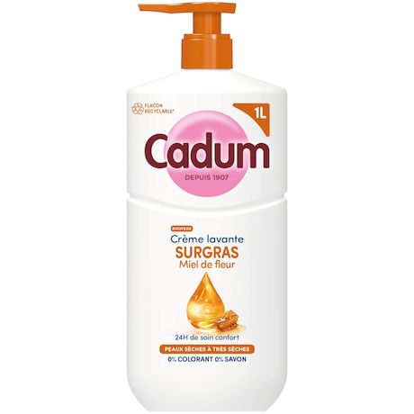 Depuis plus d’un siècle, Cadum met tout son savoir-faire au service de la douceur. Créée en 1907, la marque accompagne les familles avec des soins pensés pour respecter toutes les peaux, même les plus sensibles. Cette crème lavante surgras au miel de fleurs s’inscrit dans cette tradition et offre un moment de confort unique au quotidien. Sa texture crème nettoie délicatement et laisse la peau douce comme celle d'un bébé. Sa formule enrichie en miel de fleurs et en huile d’amande douce bio, selectionnée pour ses vertus naturellement nourisstantes, protège la peau du dessèchement. La peau est moins sèche : -39% de sécheresse cutanée**. Elle retrouve souplesse, confort et douceur, sans effet de « peau de croco ». Testée sous contrôle dermatologique, sa formule au pH neutre, sans savon ni colorant, respecte parfaitement l’équilibre cutané de toute la famille dès 3 ans. Et pour allier soin et responsabilité, Cadum propose désormais un flacon recyclable* et composé à 70 % de plastique recy