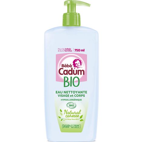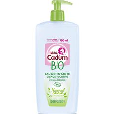 Bébé Cadum Eau Nettoyante Natural Caresse Hypoallergénique Visage et Corps certifiée BIO 750ml La peau du visage et du corps de bébé est nettoyée en douceur.