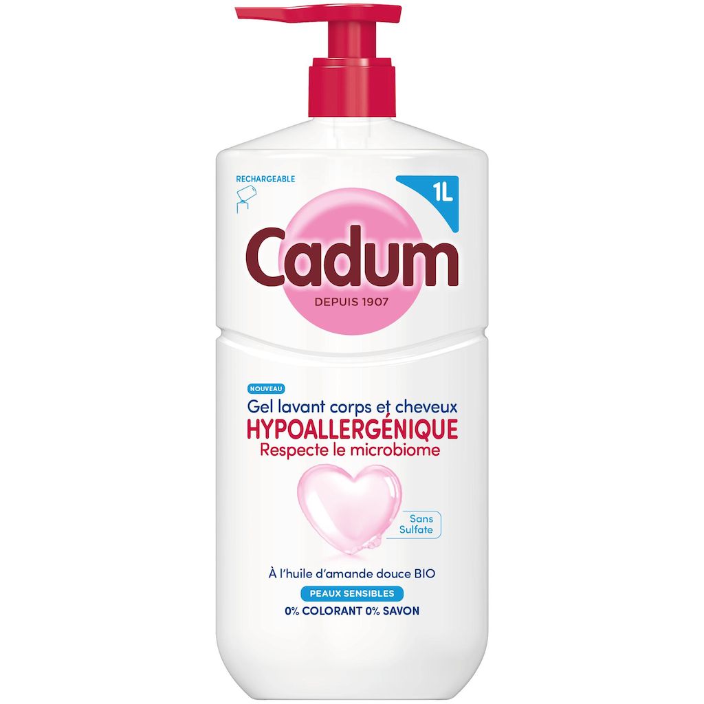 Depuis plus d’un siècle, Cadum met tout son savoir-faire au service de la douceur. Créée en 1907, la marque accompagne les familles avec des soins pensés pour respecter toutes les peaux, même les plus sensibles. Ce gel lavant hypoallergénique corps et cheveux sans sulfate s’inscrit dans cette tradition et offre un moment de confort unique au quotidien. Sa texture gel nettoie délicatement et laisse la peau hydratée durablement. Sa formule enrichie en huile d’amande douce bio selectionnée, pour ses vertus naturellement nourisstantes, apporte une sensation de confort dès la 1ère douche. Testée sous contrôle dermatologique, sa formule au pH neutre, sans savon ni colorant, respecte parfaitement l’équilibre cutané de toute la famille dès 3 ans. Et pour allier soin et responsabilité, Cadum propose désormais un flacon recyclable* et composé à 70 % de plastique recyclé**. Il est aussi plus léger : -10% de plastique par rapport à l’ancien flacon 1L. *Si jeté dans une poubelle de tri **Hors p