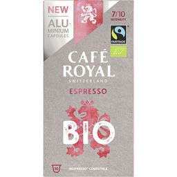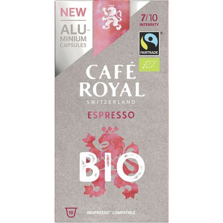 CAFE ROYAL NS Alu Espresso BIO x10 Capsules de café compatibles avec le système Nespresso®* Des notes épicées délicates et un soupçon de réglisse se marient à une acidité fraîche et fruitée pour souligner le tempérament vivace de cet Espresso puissant.Contenu: 10 capsules, café torréfié**/***, moulu, pour le système Nespresso®*. ** De production biologique. / *** Certifié Fairtrade et cultivé par des producteurs Fairtrade. Quantité totale: 100%. www.info.fairtrade.net