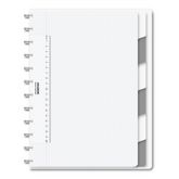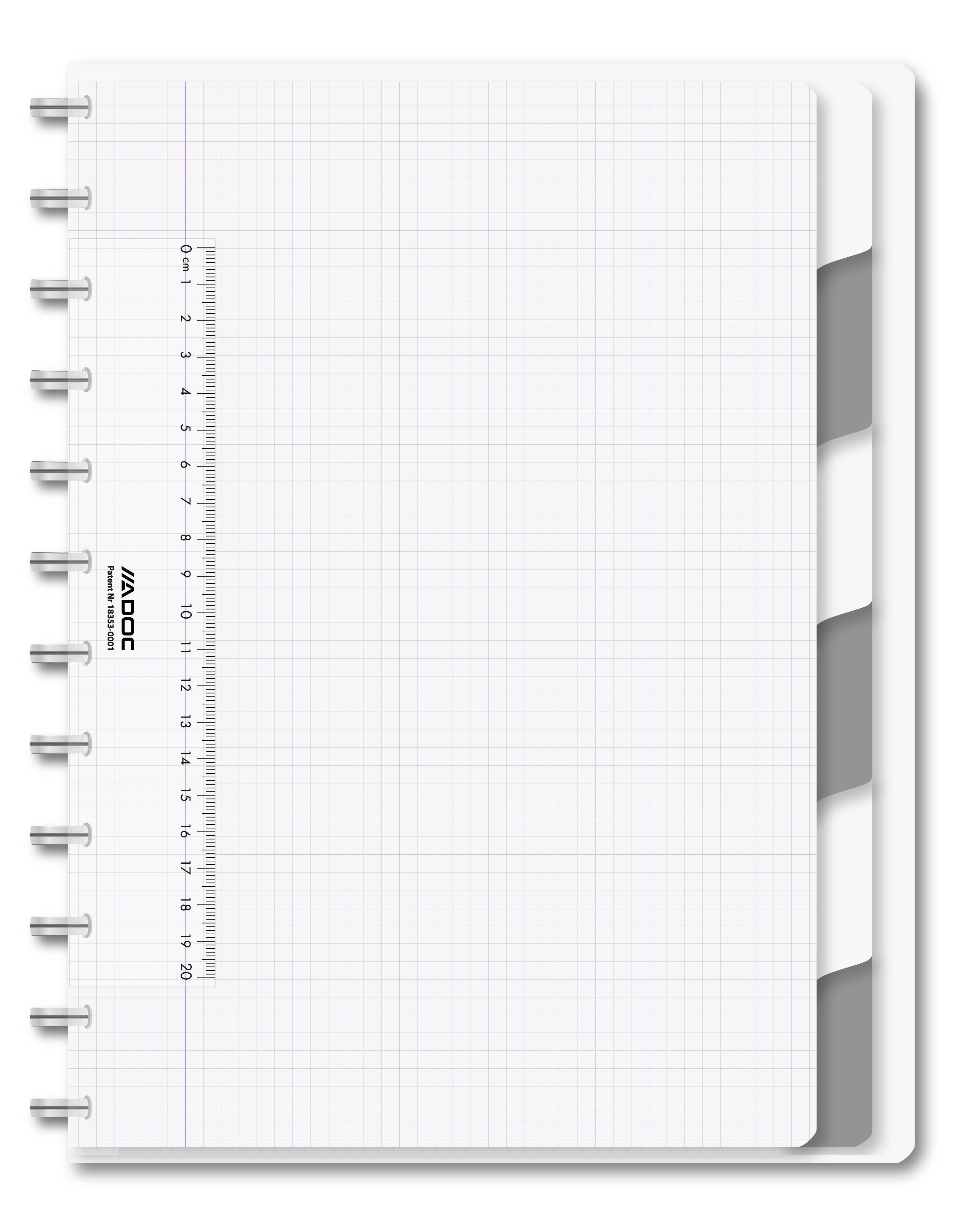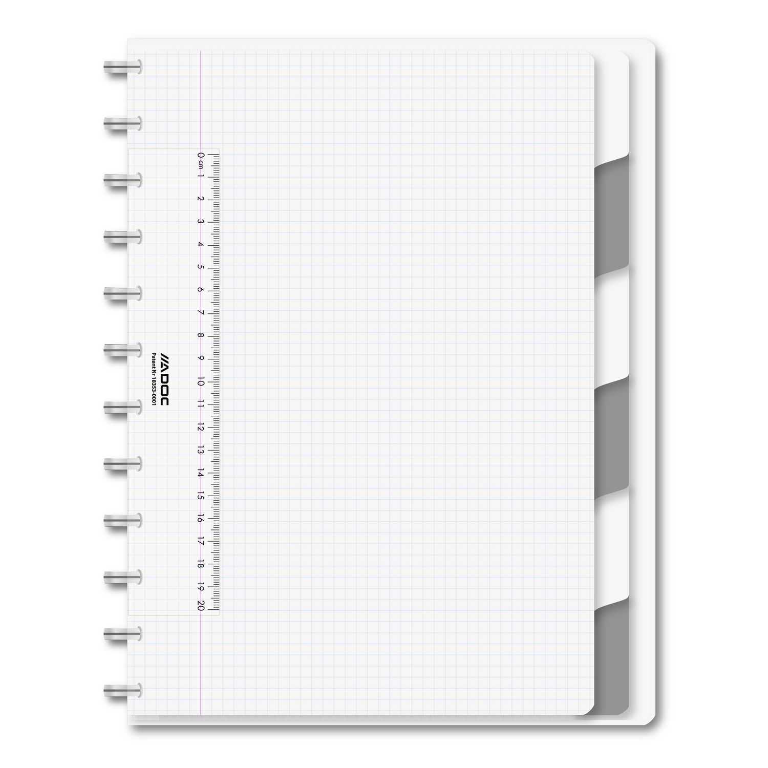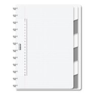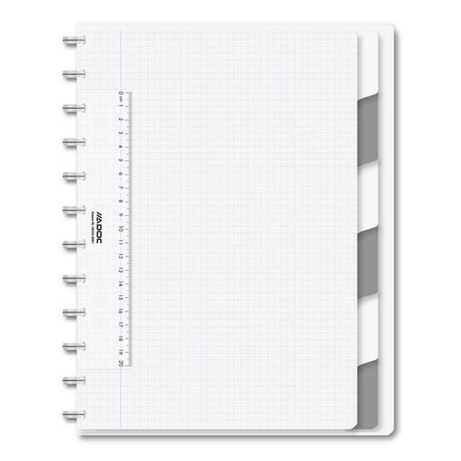 Cahier à anneaux, couverture en polypropylène de 144 pages muni de 6 intercalaires et de 5 pochettes perforées repositionnables. Pages blanches à petits carreaux.