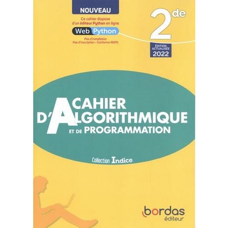 La collection de référence pour apprendre l'algorithmique et la programmation avec Python vous propose un nouveau cahier pour la alte de 2de. - La première partie de ces cahiers permet de travailler les notions de base de l'algorithmique et de la programmation en Python . Les exercices de cette part