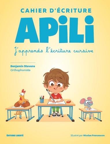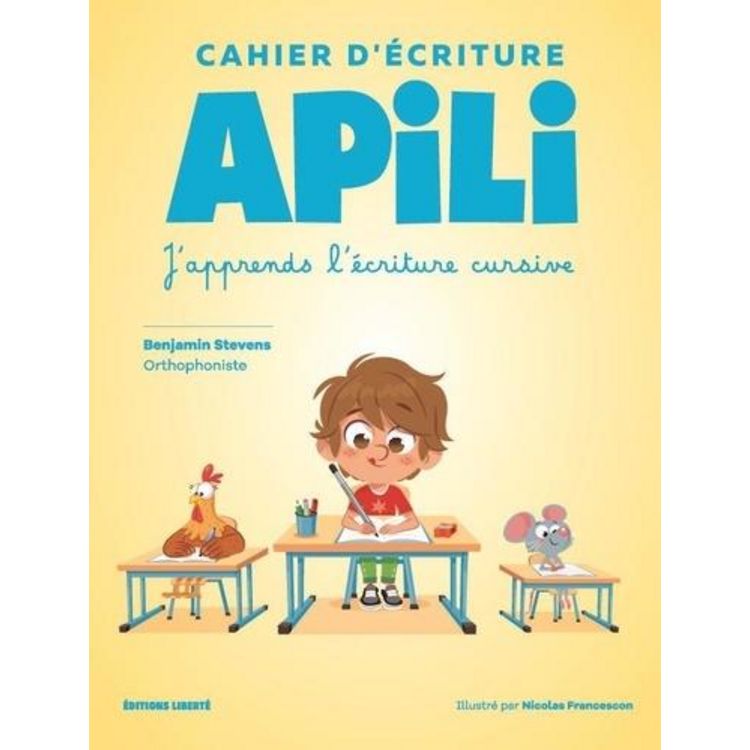 Cahier d'apprentissage de l'écriture cursive, développé par Benjamin Stevens, orthophoniste. Il a été créé afin de compléter la méthode de lecture Apili. L'apprentissage de l'écriture étant indissociable de l'apprentissage de la lecture. Ecrire aide à apprendre à lire ! Il a été conçu pour être ultra motivant pour les enfants : belles illustrations, humour, dessins, jeux... Il tient compte des dernières recherches dans le domaine de l'écriture : tracé des lettres sur les pages de gauche, écriture sur les pages de droite, progression logique, pas d'écriture de grandes lettres qui mobiliseraient toute la main de l'enfant et non les doigts... Il utilise la police de caractère belle allure , police la plus simple à reproduire pour les enfants (pas d'oeilletons, respect des variations contextuelles). Il se veut très qualitatif, papier intérieur épais de 120 grammes, facile à gommer, reliure cousue et collée à froid pour une ouverture complète. Fourni avec un crayon Faber Castell grip 2001 : triangulaire, antidérapant avec embout gomme. Ce crayon est le meilleur crayon pour l'apprentissage de l'écriture.