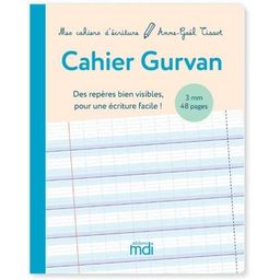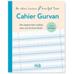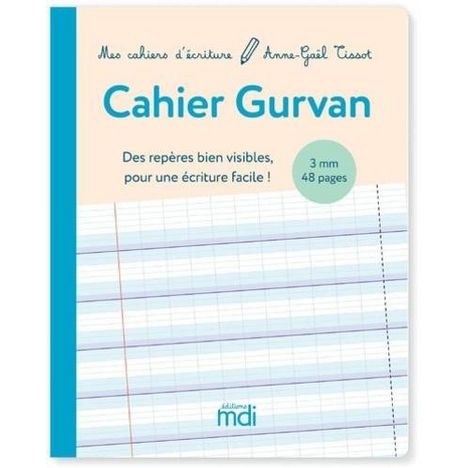 Des repères bien visibles pour une écriture facile ! Ce cahier est un cahier vierge pensé pour les enfants débutant en écriture (GS, CP) ou ayant des difficultés en écriture (élèves dyspraxiques) : . Un lignage Gurvan , aménagé et simplifié par rapport au lignage Seyès. . Un interlignage de 3 mm , adapté aux jeunes élèves qui n'ont pas encore acquis la précision nécessaire pour écrire dans le lignage 2 mm. . Un petit format à la française (17 x 22 cm) adapté aux jeunes enfants. Les + du lignage Gurvan : Une ligne de base bien marquée pour savoir où écrire. Des interlignes de couleur pour bien percevoir la hauteur des lettres. Un espace agrandi entre les lignes pour éviter les enchevêtrements. Des pointillés pour savoir quand retourner à la ligne. La collection Mes cahiers d'écriture , c'est : Une méthode guidée d'apprentissage de l'écriture, de la MS au cycle 3. . Des activités préparatoires ludiques pour apprendre à maîtriser les bons gestes. . Une progression d'apprentissage logique en fonction de la forme des lettres. . Des modèles de lettres conformes aux recommandations de l'éducation nationale. . Un lignage aménagé, le lignage Gurvan, plus simple que le Seyès et avec des repères bien visibles. . L'auteure : Anne-Gaël Tissot est graphopédagogue et exerce à Obernai (Alsace). Elle est la créatrice du lignage Gurvan et tient le blog sos-ecriture. com.