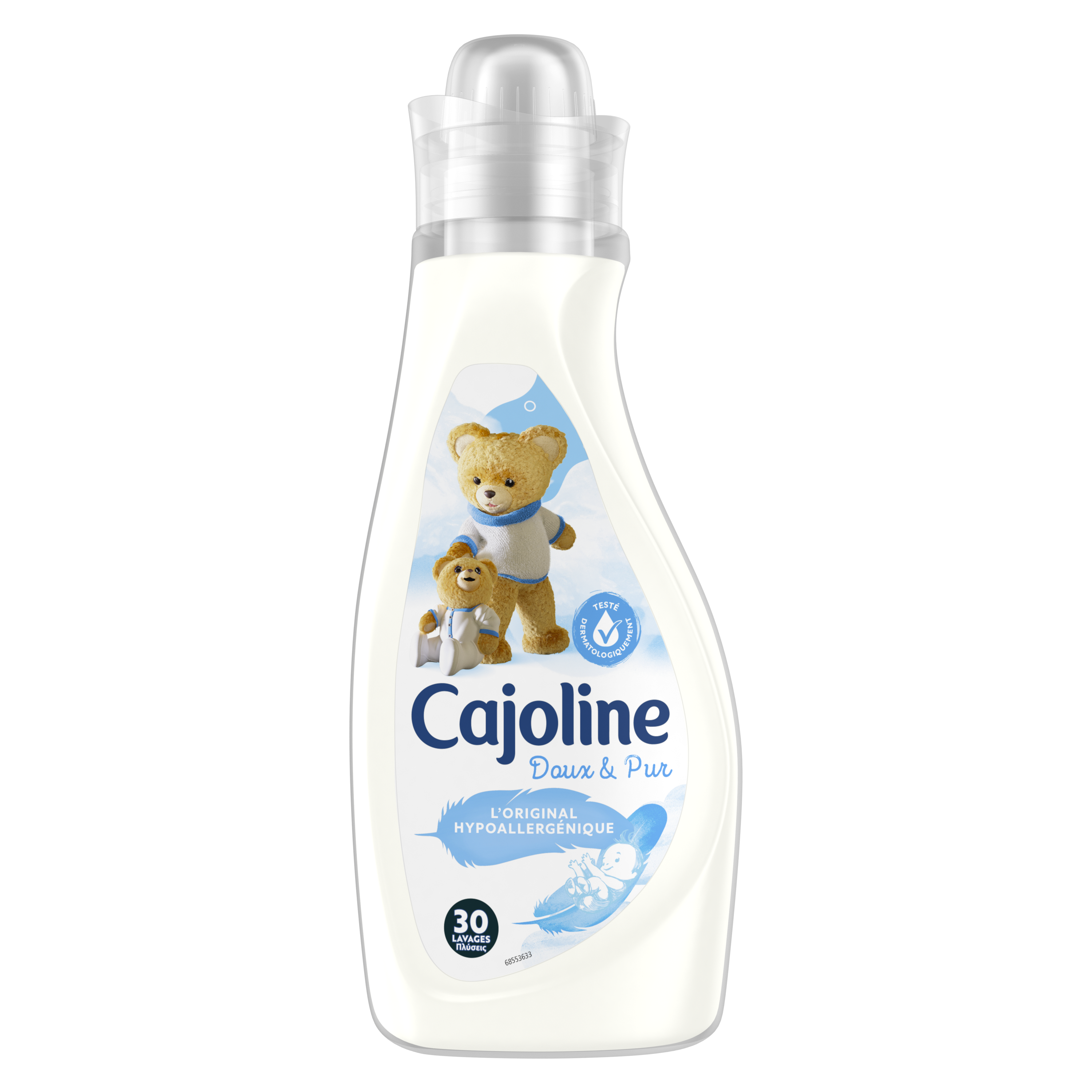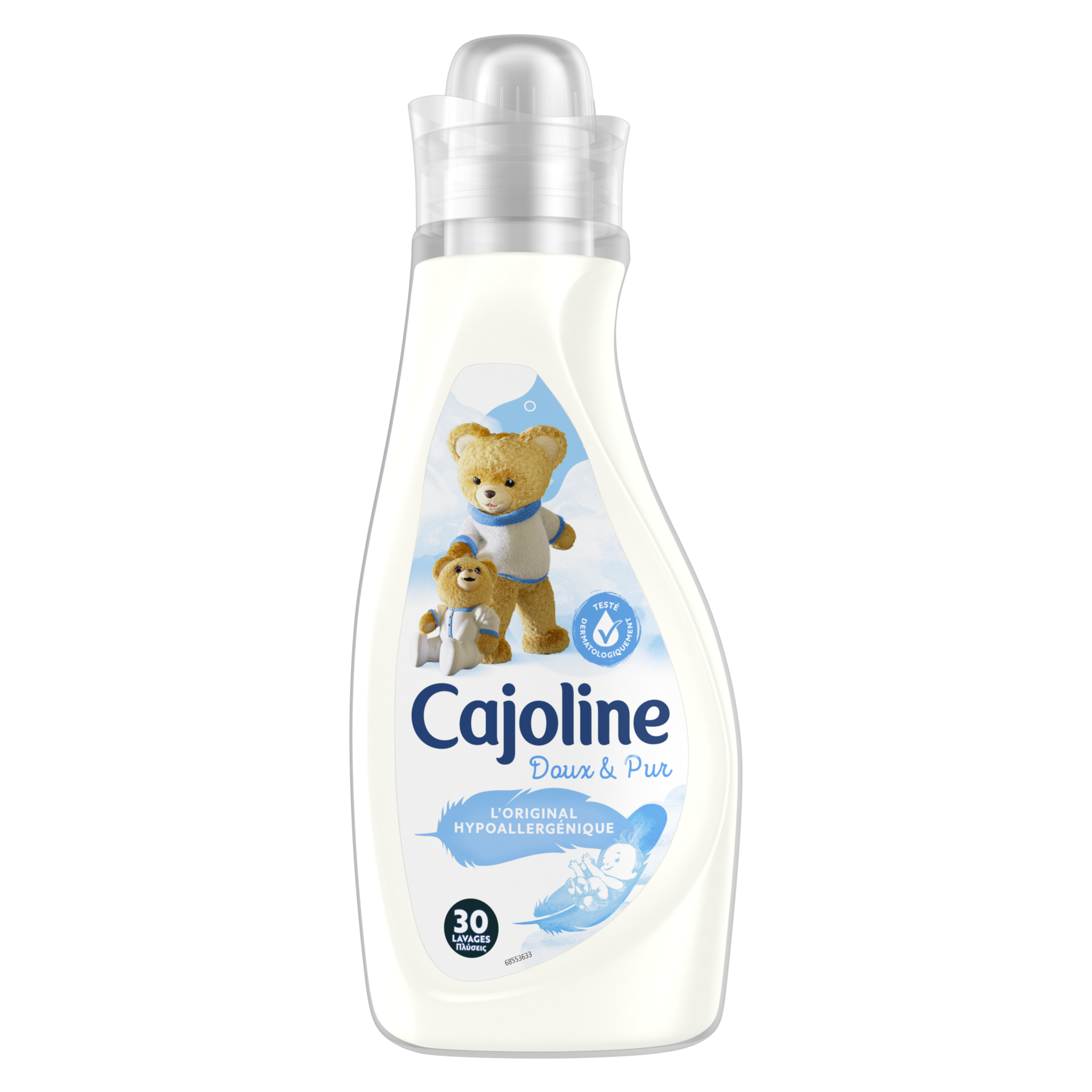 Spécialement développée pour les peaux sensibles et délicates telles que celles des bébés, la formule hypoallergénique* et testée dermatologiquement de l'adoucissant Doux & Pur offre une extrême douceur à vos vêtements. *conçue pour minimiser les risques d'allergies L’adoucissant Hypoallergénique respecte les peaux les plus sensibles et protège les fibres pour des vêtements comme neufs, plus longtemps. Sa formule donne la garantie aux jeunes parents d’une haute tolérance et d’un linge d’une grande douceur afin de prévenir les risques d’irritation ou d’allergie de la peau du bébé. De plus, il facilite le repassage et réduit le temps de séchage. Cajoline a créé un monde de douceur et de parfum pour toute la famille. Depuis toujours, Cajoline a su allier Douceur, Fraîcheur, Parfum & Praticité et met à profit ses 40 ans d'expertise pour vous permettre de garder vos vêtements beaux plus longtemps ! Cajoline apporte aussi sa contribution à l’effort de respect de l’environnement à travers de multiples démarches : •Cajoline a choisi des agents actifs rapidement biodégradables. •Cajoline utilise uniquement des bouteilles recyclables. Pensez à bien trier vos bouteilles vides, elles pourront ainsi être recyclées. •Cajoline a signé la Charte du nettoyage durable. Cela signifie que la marque s’engage volontairement à améliorer sans cesse son comportement en matière de développement durable. Non aux bouloches et aux vêtements déformés ! A la longue, le lavage en machine abîme les fibres de votre linge, provoquant l’apparition de fibrilles qui donnent cet aspect usé à vos vêtements, et qui sont bien souvent sources de démangeaisons. Les adoucissants Cajoline gainent ces fibrilles, vous permettant de garder vos vêtements beaux plus longtemps ! Afin de s’adapter aux besoins de chacun, les adoucissants Cajoline sont aujourd’hui disponibles sous différents formats: ultra-concentrés 960 mL, concentrés 1,5L, concentrés 750 mL et semi-concentrés 2L. Assouplissant Concentré