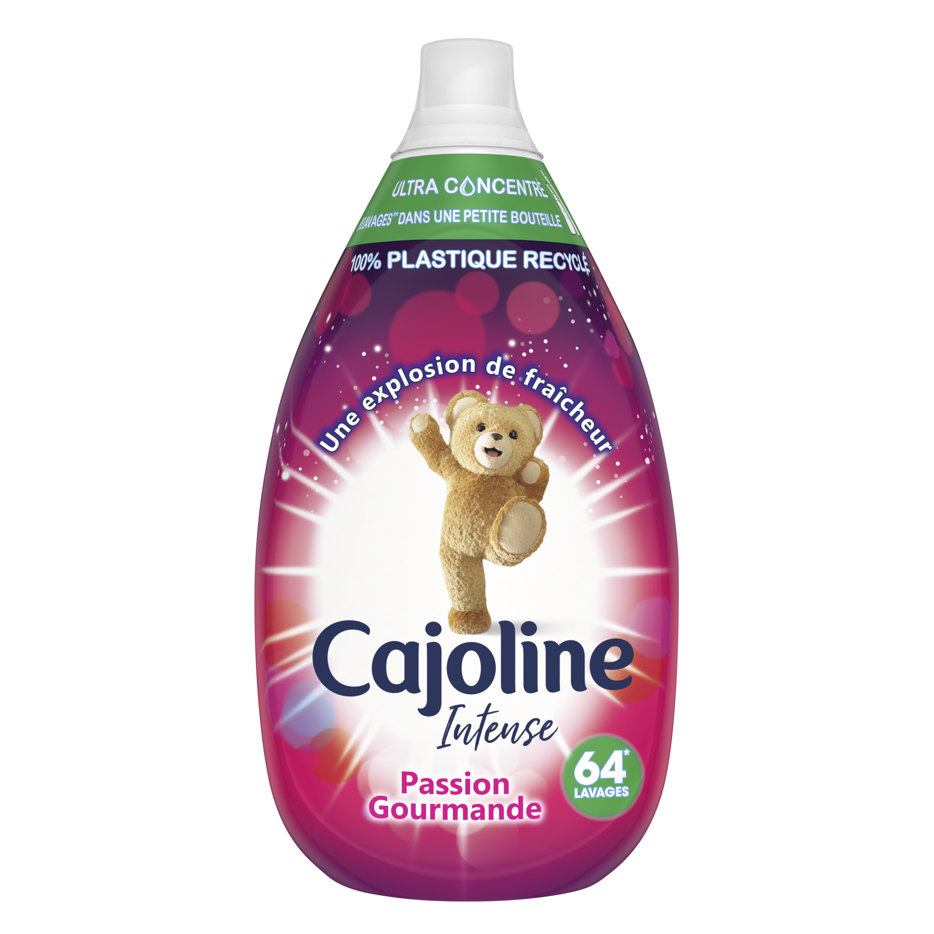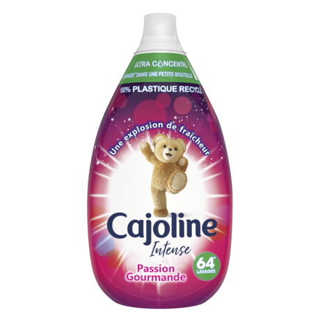 Chaque goutte ultra-concentrée de l'adoucissant Cajoline Intense Passion Gourmande laisse vos sens s'évader avec des explosions délicieuses de fruits rouges et de fleurs sur un fond gourmand de vanille. Avec Cajoline Adoucissant Intense, votre linge continue de sentir merveilleusement bon, même après un séjour dans votre penderie. L'adoucissant Cajoline ne se contente pas d'adoucir et de parfumer votre linge. Il préserve l'éclat et la couleur des vêtements, facilite le repassage et réduit le temps de séchage. Cajoline a créé un monde de douceur et de parfum* pour toute la famille. Pour vous rendre la vie plus douce et plus agréable, Cajoline vous offre un parfum de longue durée grâce à une technologie d’encapsulation. Depuis toujours, Cajoline a su allier Douceur, Fraîcheur, Parfum & Commodité et met à profit ses 40 ans d'expertise pour vous permettre de préserver plus longtemps la beauté de vos vêtements. Cajoline apporte aussi sa contribution aux efforts pour respecter l’environnement à travers de multiples démarches : • Cajoline utilise dans ses formules des agents actifs rapidement biodégradables. • Toutes les bouteilles Cajoline sont recyclables. Pensez à bien trier vos bouteilles vides, elles pourront ainsi être recyclées. • Cajoline a signé la Charte du nettoyage durable. Cela signifie que la marque s’engage volontairement à améliorer sans cesse son comportement en matière de développement durable. *parfum de synthèse Non aux bouloches et aux vêtements déformés ! À la longue, le lavage en machine abîme les fibres de votre linge, provoquant l’apparition de fibrilles qui donnent cet aspect usé à vos vêtements, et qui sont bien souvent sources de démangeaisons. Les adoucissants Cajoline gainent ces fibrilles et vous permettent de préserver plus longtemps la beauté de vos vêtements ! Afin de s’adapter aux besoins de chacun, les adoucissants Cajoline sont aujourd’hui disponibles sous différents formats : ultra-concentrés 960 ml, concentrés 1,5 l, concentrés 750 ml et semi-concentrés 2 l. Assouplissant Concentré