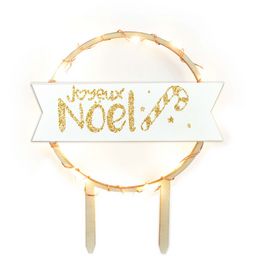 Illuminez la bûche de Noël avec ce cake topper en bois à LED ! Idéal pour l'arrivée de la bûche : personne ne la manquera ! Inscription : Joyeux Noël. En bois. Dimensions : 12 x 10 x 0,5 cm. Piles incluses. Ne passe pas au lave-vaisselle ni au four. Ne pas mettre sous l'eau. Entretien : Lors de la première utilisation et après chaque utilisation, utilisez une éponge légèrement humide.