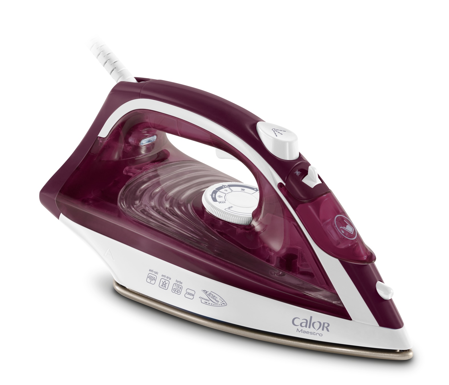 2300 W, Débit vapeur 35 g/min, Fonction pressing 110 g/min, Réservoir d'eau 270 mL, Semelle en céramique, Système anti-goutte, Système anti-calcaire