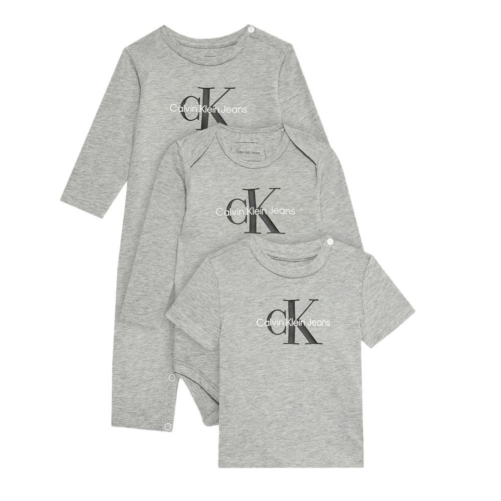 Optez pour cet ensemble Calvin Klein Jeans!Coloris : GrisCol rondManches longuesComposition : 93% coton, 7% élasthanneContient un pyjama sans pied, un body et un t-shirt