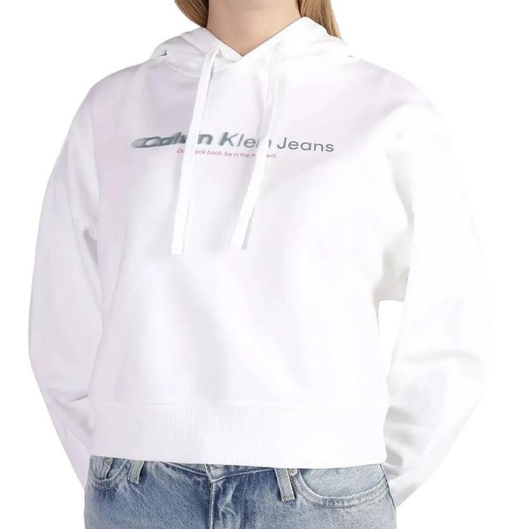 Découvrez ce sweat femme de la marque Calvin Klein ! Couleur : Blanc Coupe crop topCapuche avec cordons de serrageImprimé sur le devantComposition : 95% coton, 5% élasthanne