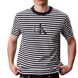 Optez pour le t-shirt de la marque CALVIN KLEIN JEANS !Coloris : Noir/Gris Col rond Manches courtes Rayures Logo CK Composition : 100% Coton