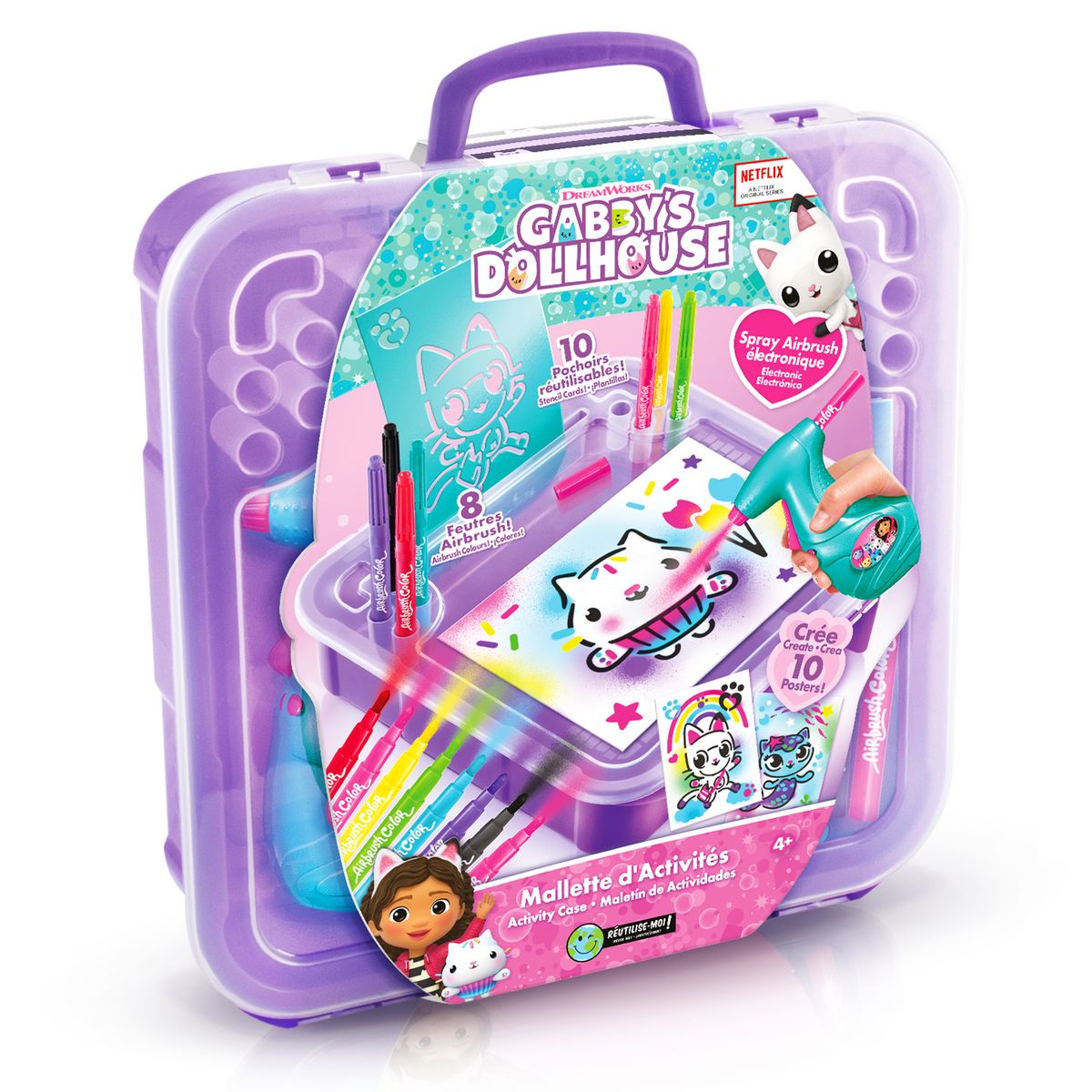 Crée d'adorables dessins avec la mallette Gabby et la Maison Magique ! Elle contient tout ce qu'il te faut pour créer des dessins uniques : spray électronique, feutres, pochoirs, feuilles… Ré-utilise la mallette pour ranger et transporter tes dessins !