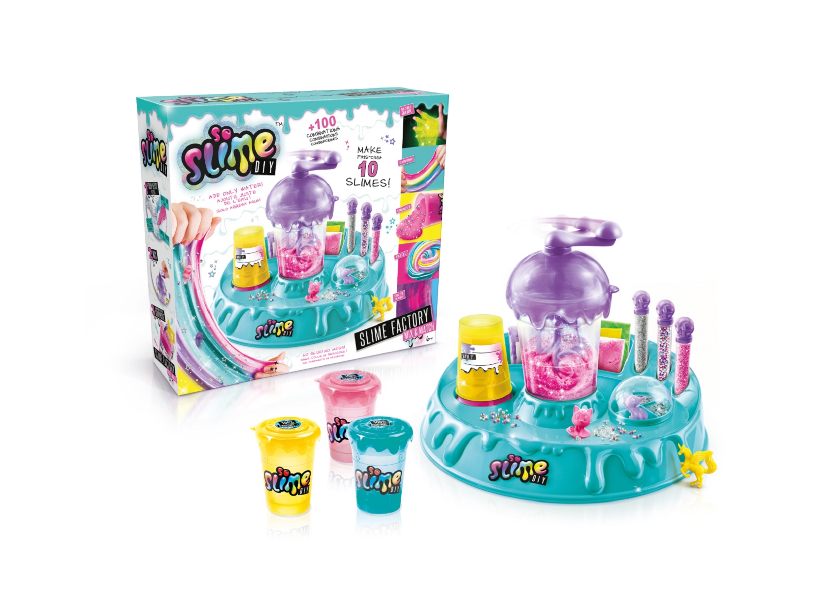 1 fabrique et 1 mélangeur, 3 shakers, 10 sachets de slime en poudre, 3 tubes, 9 sachets de décorations, 4 surprises, 1 outil et 1 entonnoir