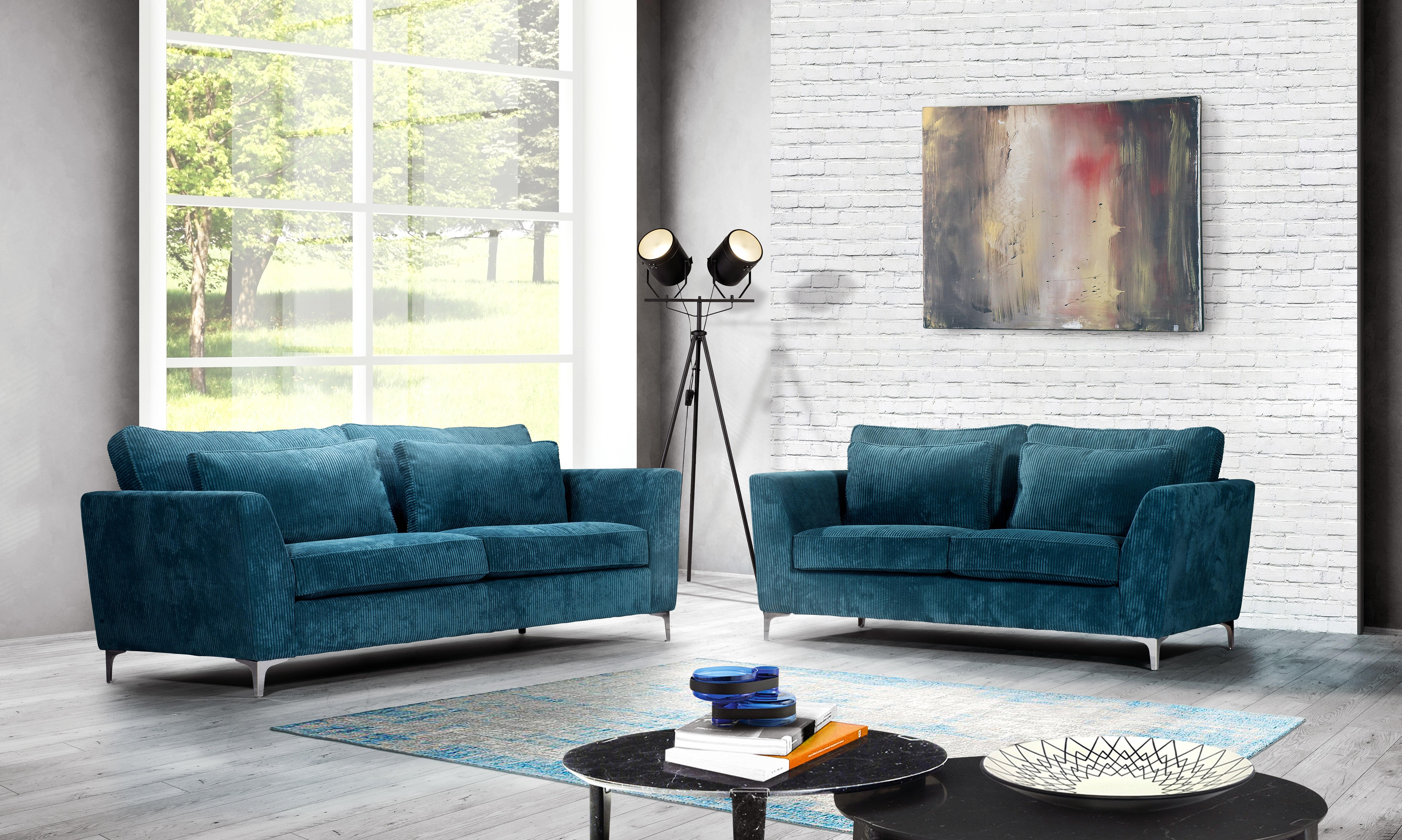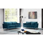 Gardez un style élégant grâce à ce bel ensemble de canapés 2 ou 3 places en tissu velours bleuté et aux pieds en métal. Avec son revêtement au toucher doux très accueillant cet ensemble de canapés vous installera très confortablement dans votre salon. Ces canapés 2 et 3 places de fabrication europée