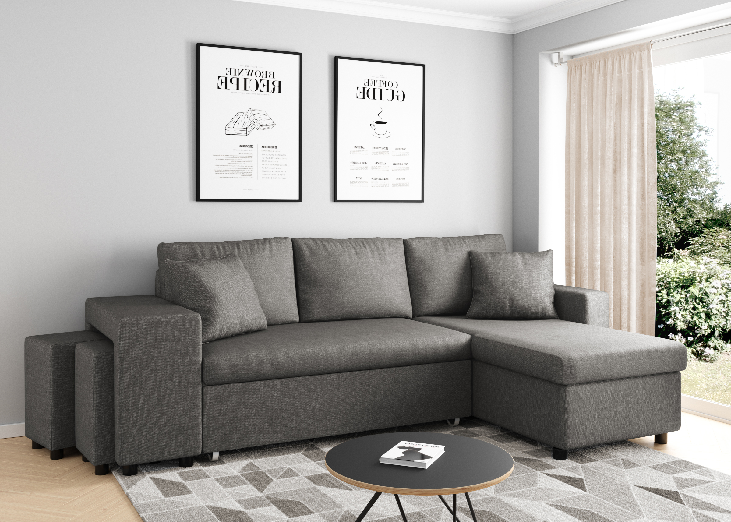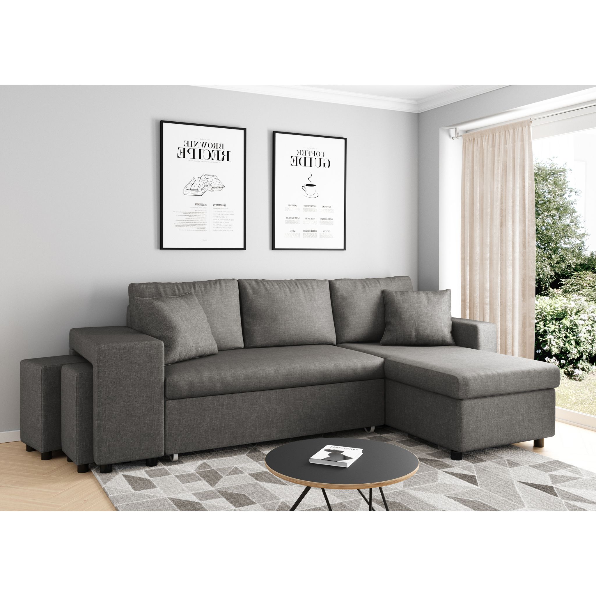 Canapé 3 places d'angle Droit convertible avec coffre Microfibre gris tissu + 2 poufs inclus ANETTA