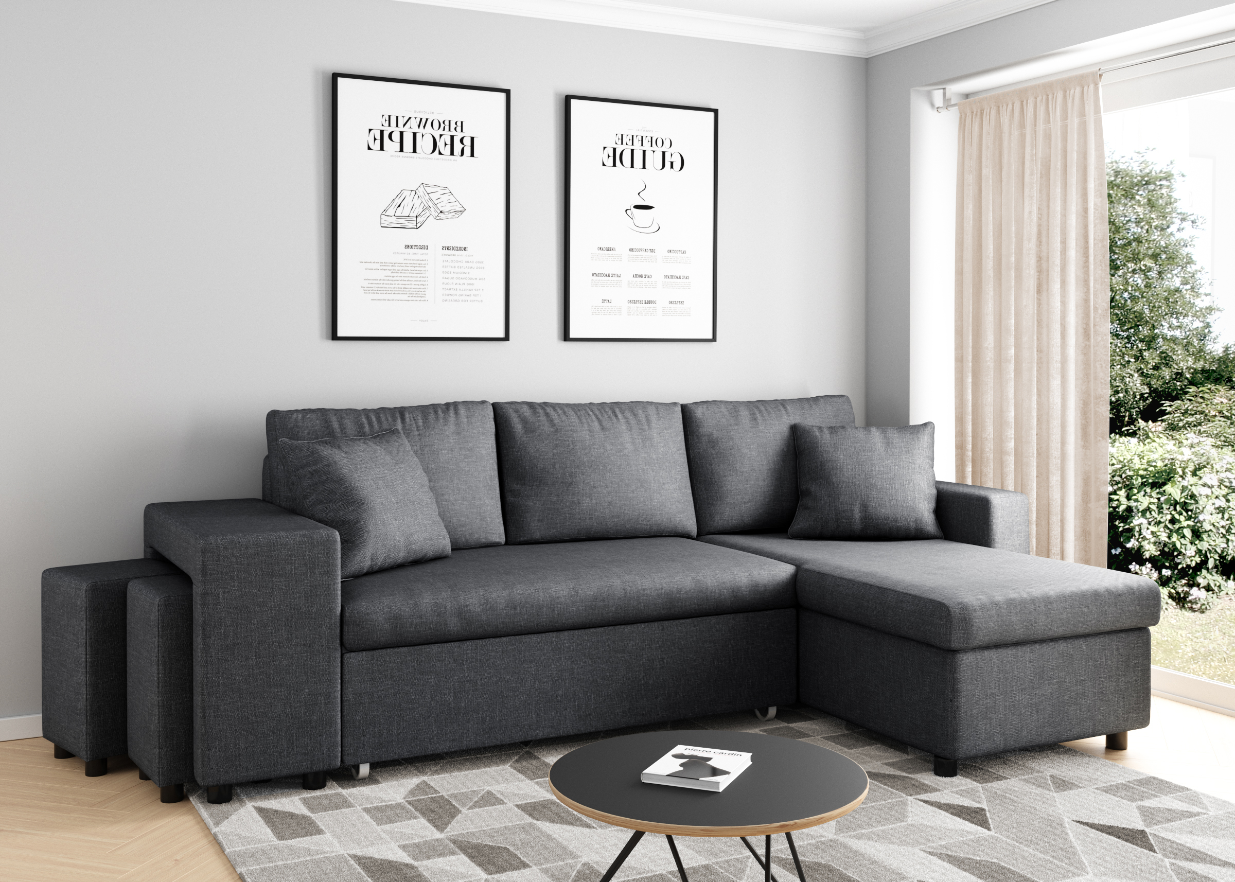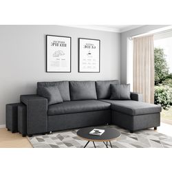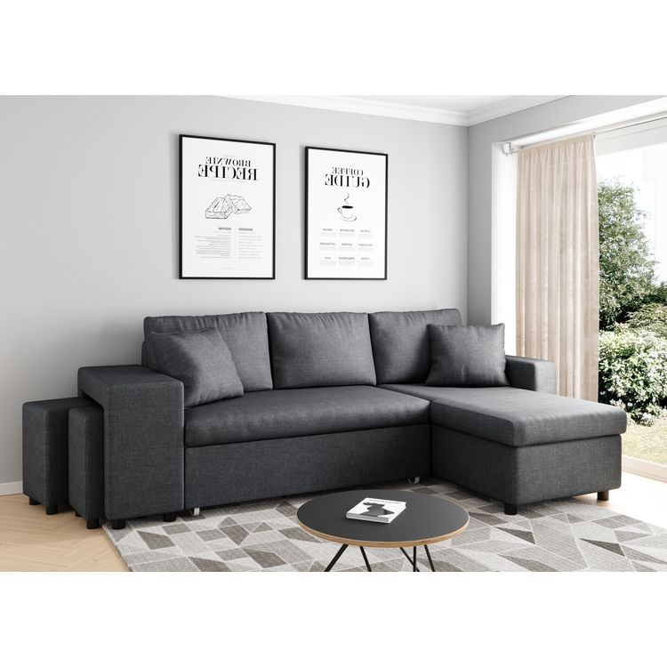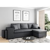 Canapé 3 places d'angle Droit convertible avec coffre Tissu gris foncé+ 2 poufs inclus ANETTA
