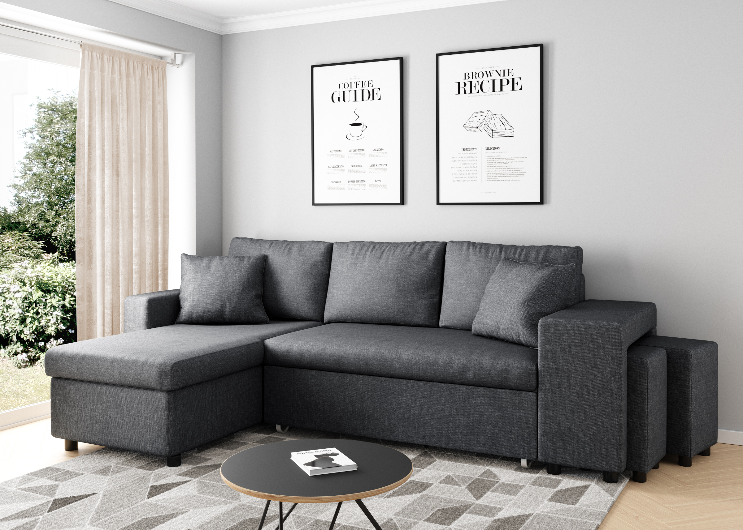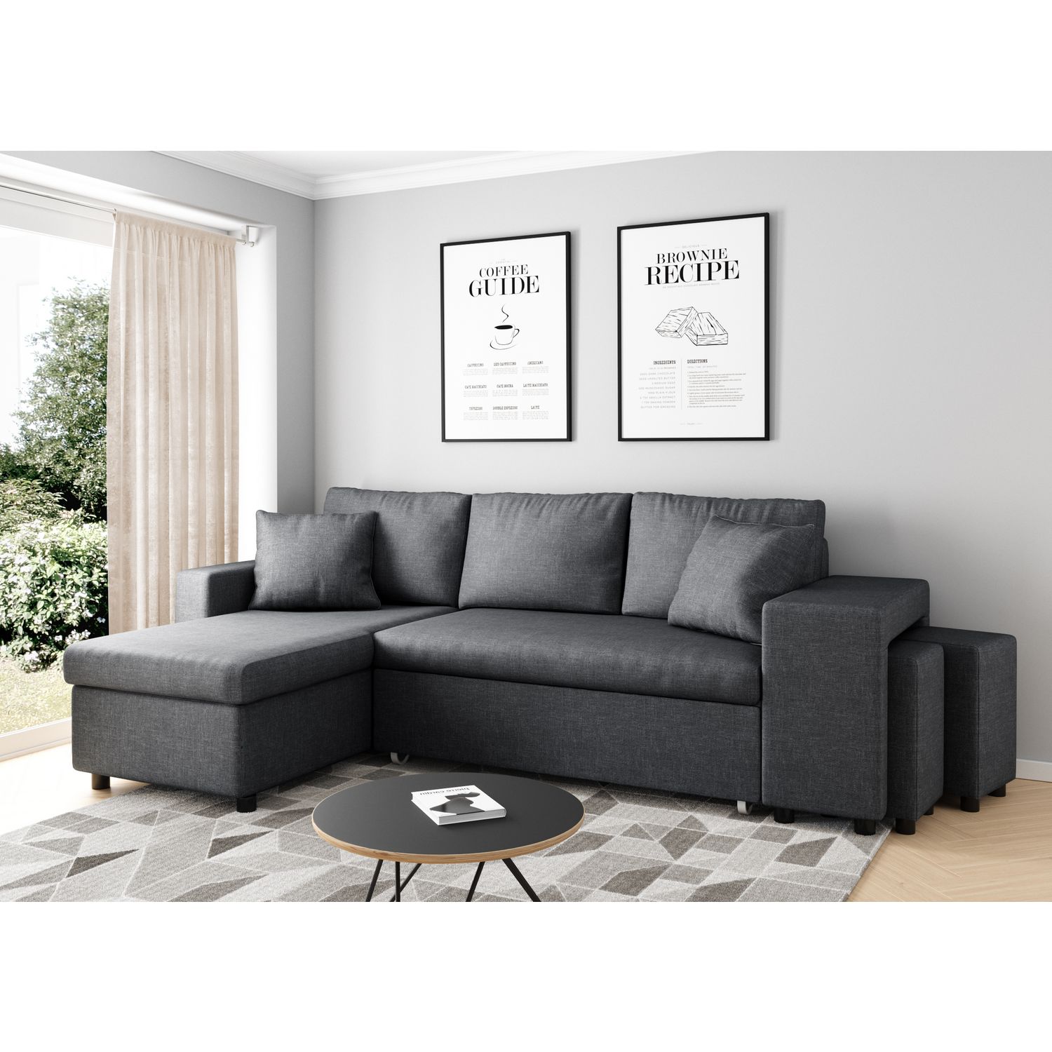 Canapé 3 places d'angle Gauche convertible avec coffre Tissu gris foncé+ 2 poufs inclus ANETTA
