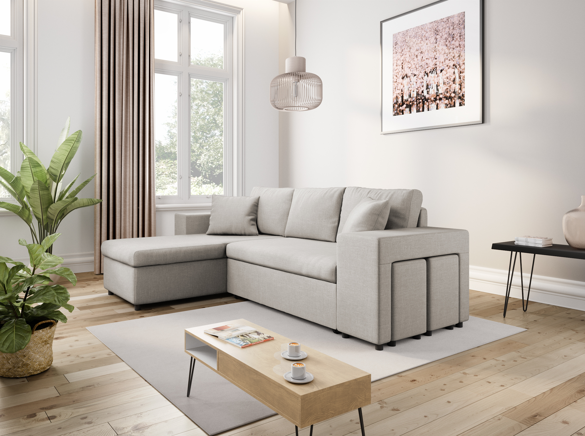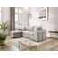 méridienne d'angle réversible gauche-droite - coffre de rangement sous méridienne - accoudoir fixe à droite avec 2 poufs - accoudoir fixe à gauche avec étagères - convertible en lit - production européenne - coussins décoratifs déhoussables