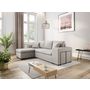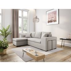 Ce canapé pour 5 personnes (3 places canapé + 2 poufs) est convertible, il dispose d'un couchage d'appoint de 140x190cm. Il offre un grand coffre de rangement placé sous la méridienne. Très fonctionnel, il possède également 2 poufs avec niche de rangement et une étagère encastrée dans l'accoudoir gauche. Dimensions du canapé : 254 x 148 x 81 cm.