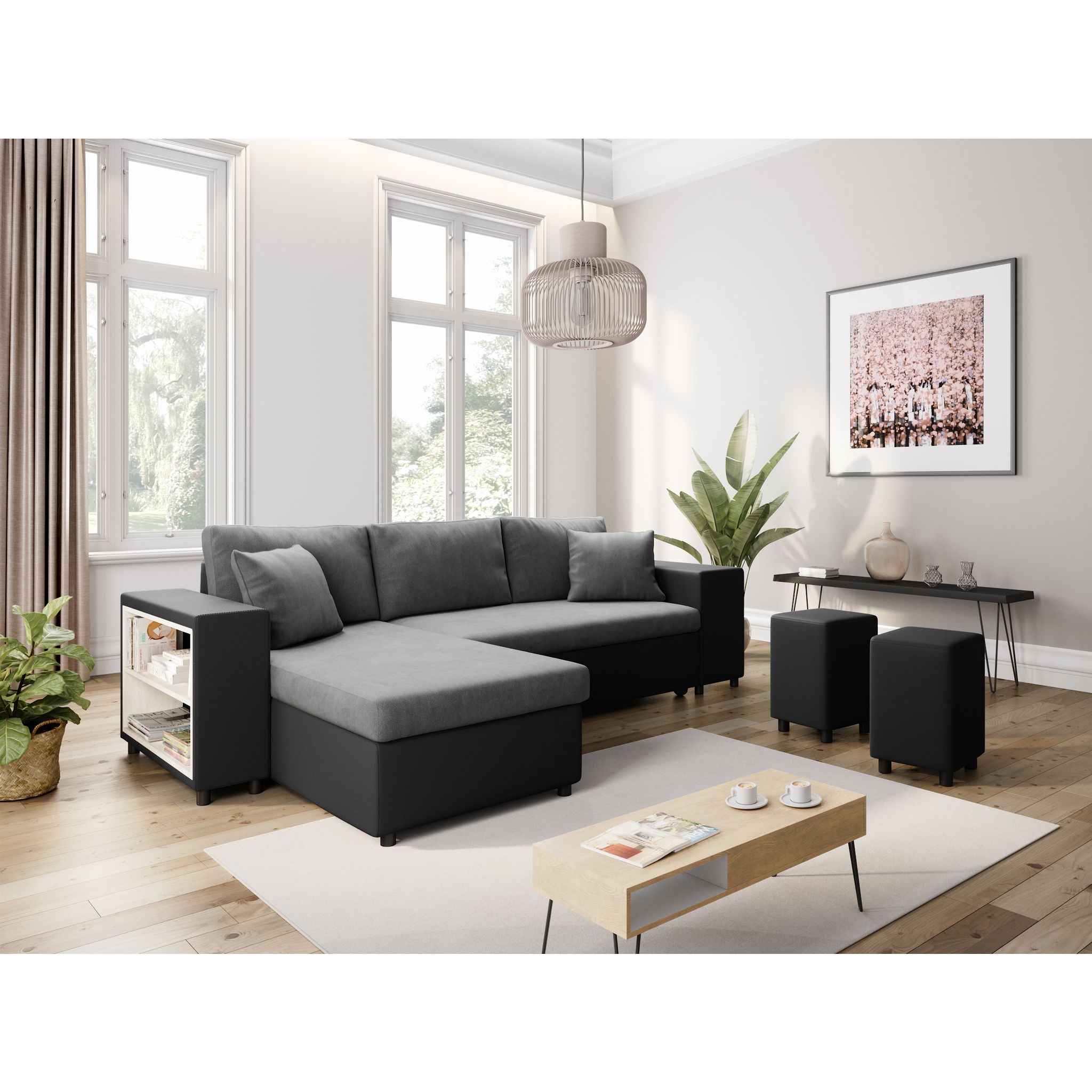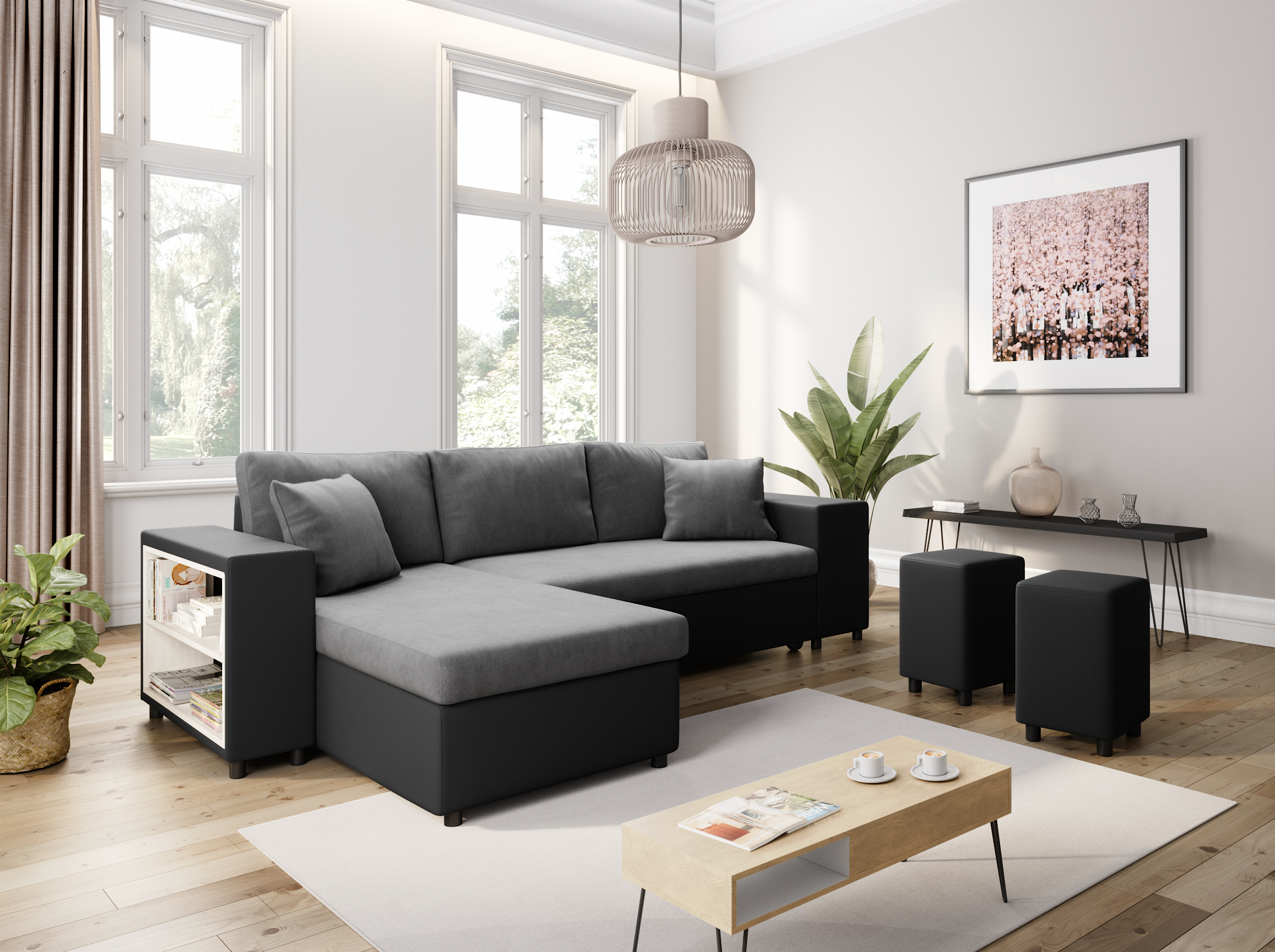 Ce canapé pour 5 personnes (3 places canapé + 2 poufs) est convertible, il dispose d'un couchage d'appoint de 140x190cm. Il offre un grand coffre de rangement placé sous la méridienne. Très fonctionnel, il possède également 2 poufs avec niche de rangement et une étagère encastrée dans l'accoudoir. Dimensions du canapé : 254 x 148 x 81 cm.
