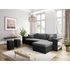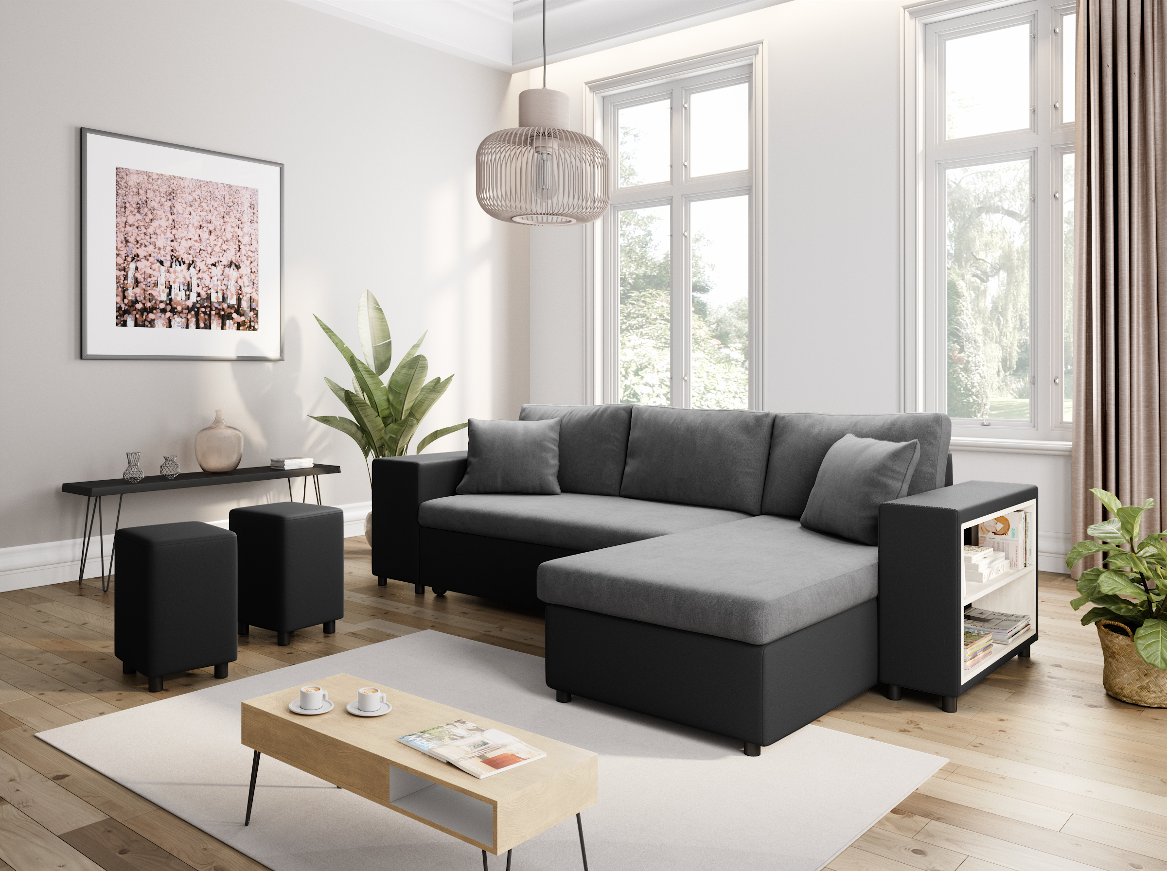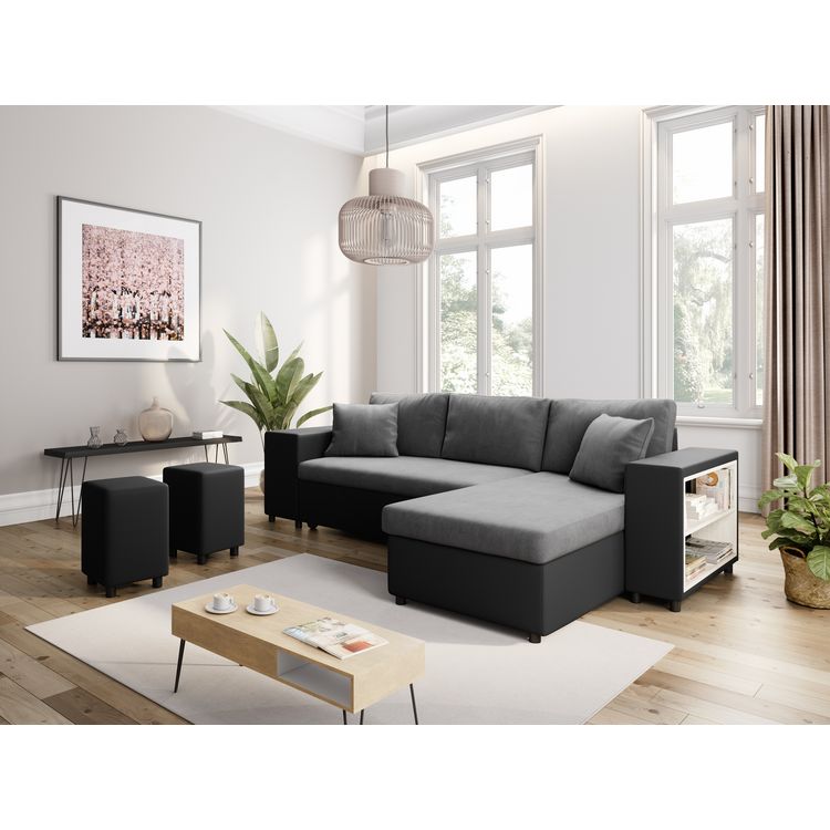 Canapé d'angle convertible avec coffre 3 places + 2 poufs à gauche et étagère à droite MACHA