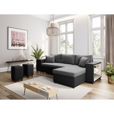 Avec son design intemporel, ce grand canapé d'angle 5 places (3 places canapé + 2 poufs) s'intègrera facilement à tous les styles d'intérieur. Ses fonctions sont multiples : grand coffre de rangement, fonction lit convertible, méridienne réversible qui permet de pouvoir moduler votre canapé et votre salon à votre convenance et également une niche non-réversible (fixe) servant de large accoudoir qui permet d'y intégrer 2 poufs pour offrir 2 assises supplémentaires. L'autre accoudoir fixe avec les étagères. C'est le canapé idéal pour recevoir amis et famille ! Ses différentes déclinaisons de revêtements et de coloris vous permettront de choisir avec exactitude le style qui correspond à votre intérieur. Deux petits coussins ton sur ton sont fournis pour plus de confort.