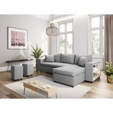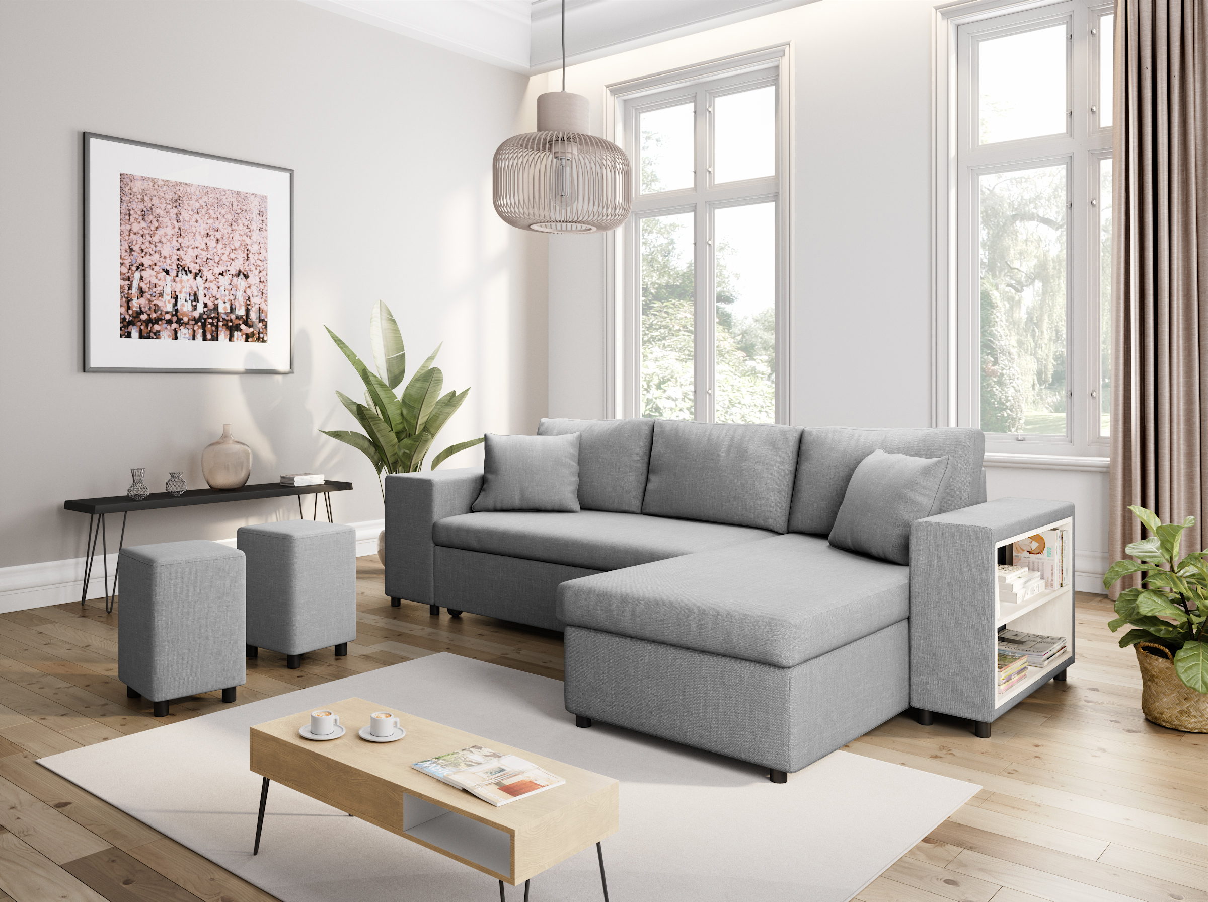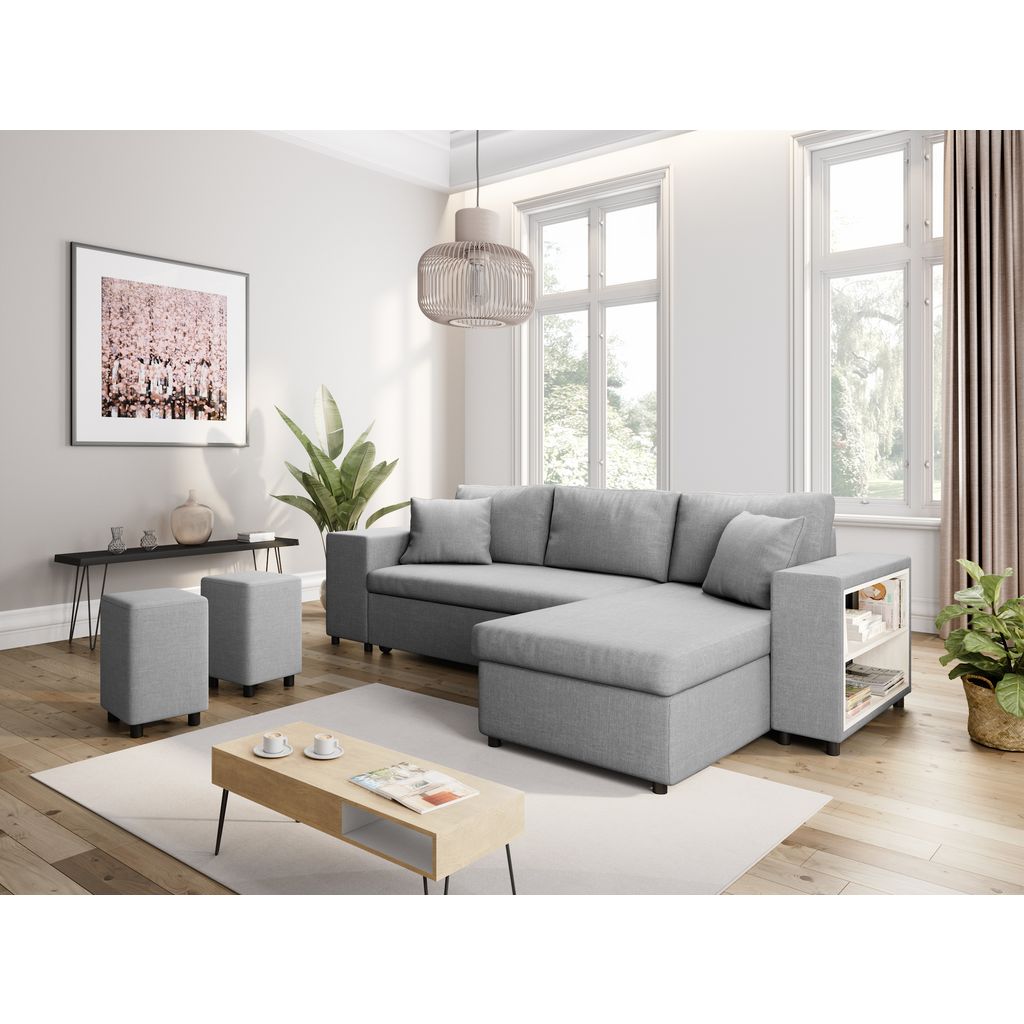 Canapé d'angle convertible avec coffre 3 places + 2 poufs à gauche et étagère à droite MACHA