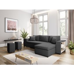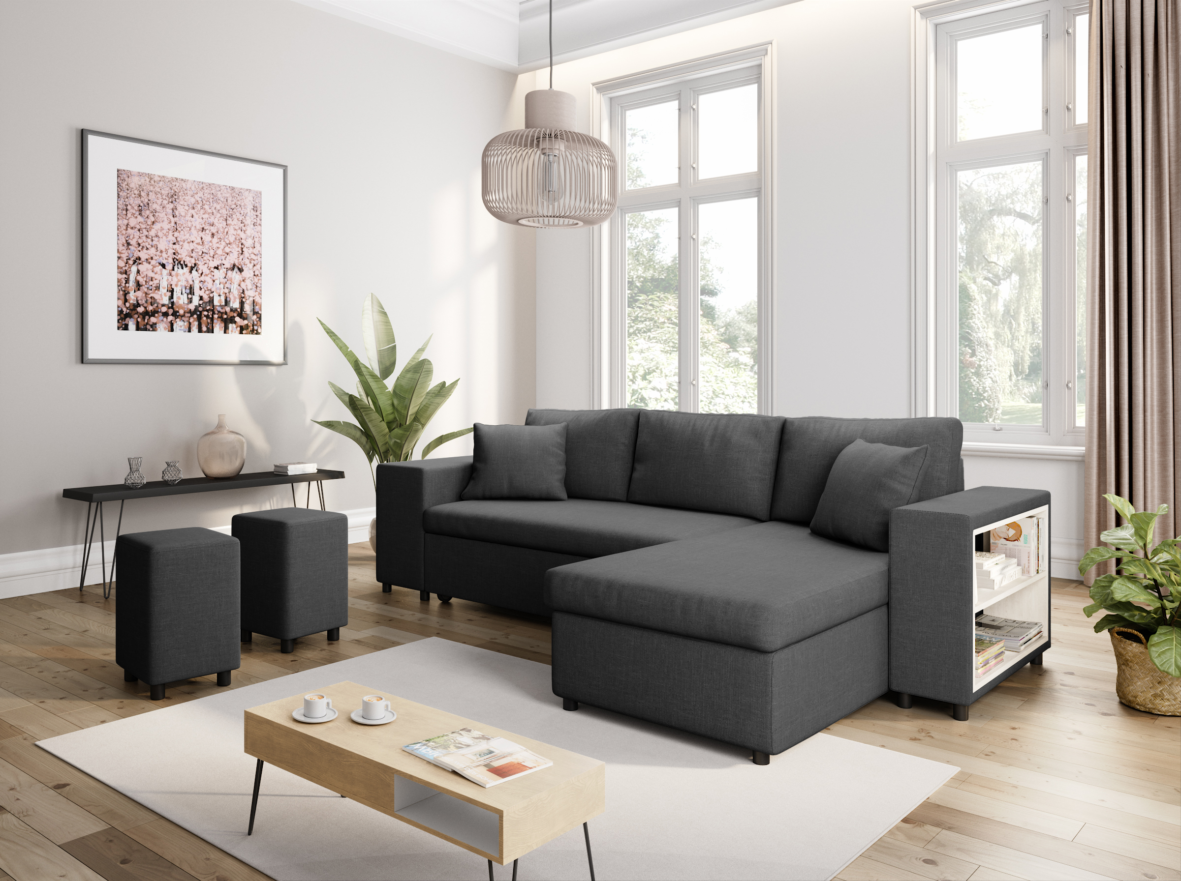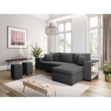 Ce canapé pour 5 personnes est convertible, il dispose d'un couchage d'appoint de 140x190cm. Il offre un grand coffre de rangement placé sous la méridienne. Très fonctionnel, il possède également 2 poufs avec niche de rangement et une étagère encastrée dans l'accoudoir. Dimensions du canapé : 254 x 148 x 81 cm.