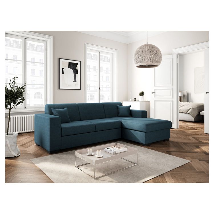 Découvrez le canapé d'angle droit en tissu CARAIBE, avec son design moderne et ses lignes épurées, il saura à coup sûr trouver sa place dans votre intérieur. Convertible, il vous permettra d'accueillir le temps d'un week-end, famille ou amis. Le plus produit : une méridienne avec coffre pour y ranger couette, oreiller et draps par exemple. Craquez et laissez-vous séduire par le canapé d'angle droit en tissu CARAIBE.