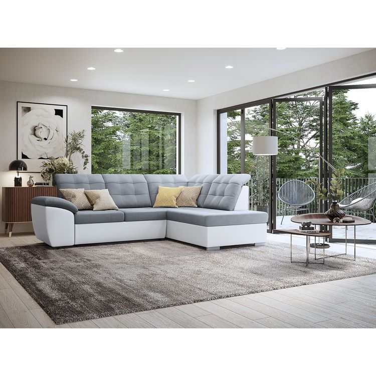 Canapé d'angle droit convertible avec coffre et repose tête réglable en tissu gris + pu blanc RECITAL