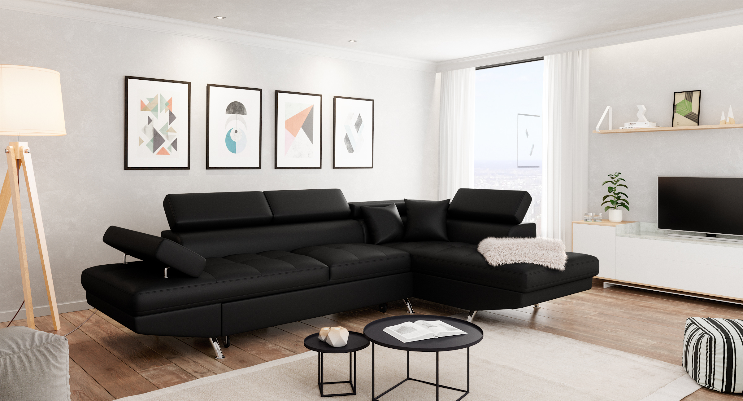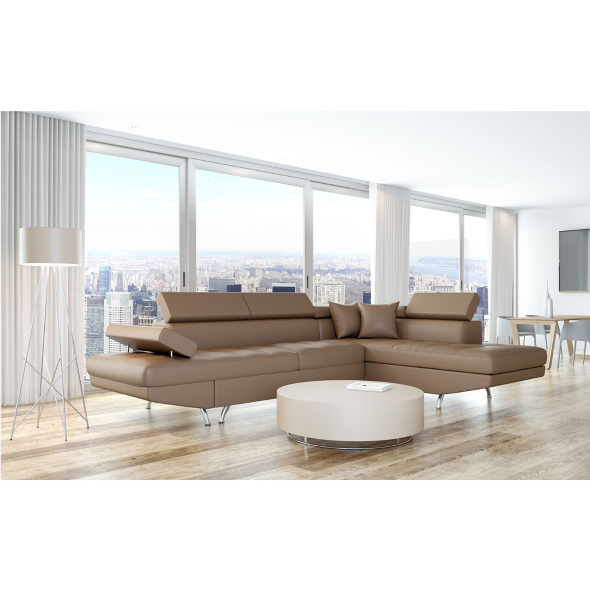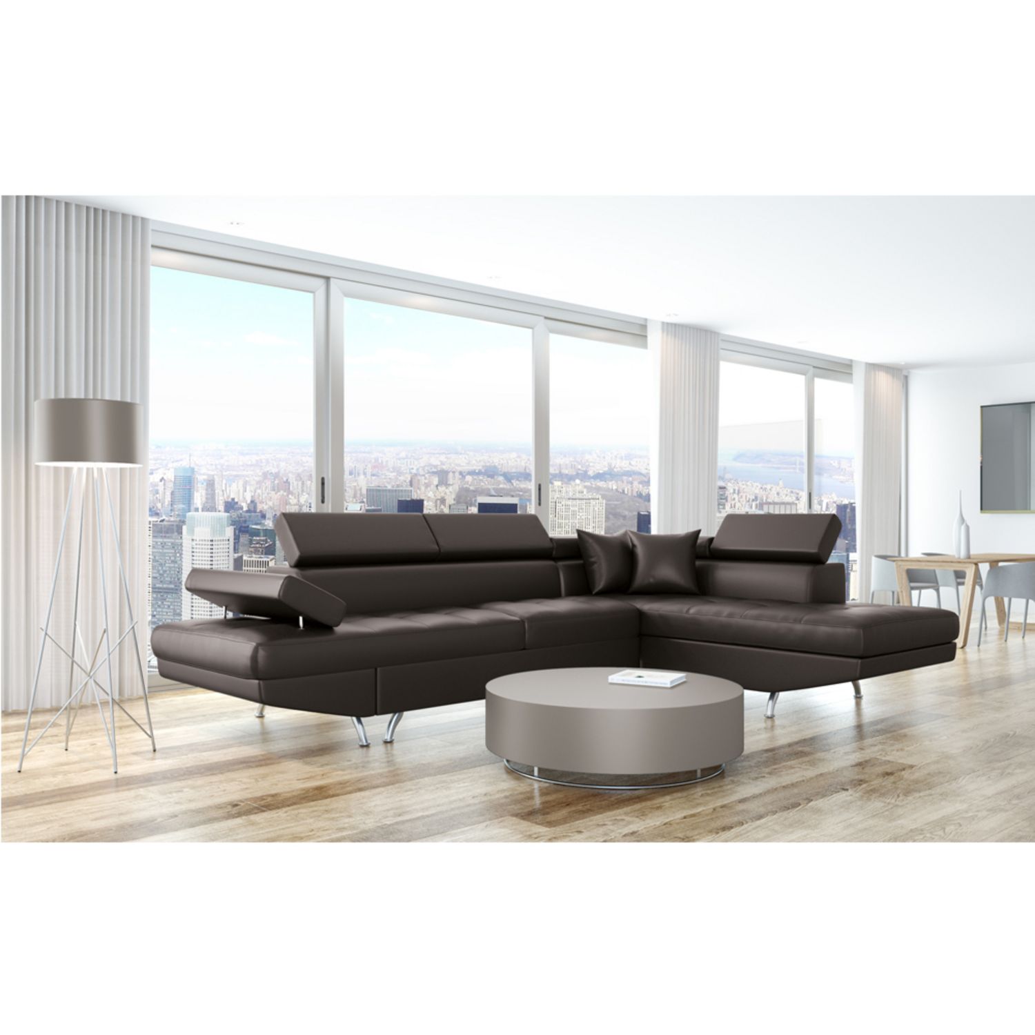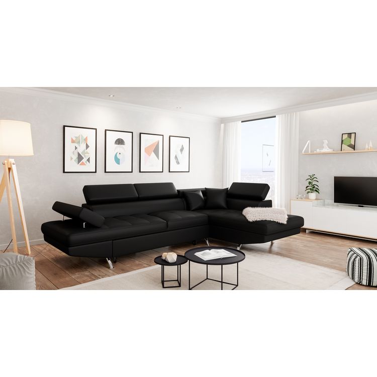 Relaxez vous grâce au canapé d'angle droit CHICAGO ! Ses lignes modernes, ses pieds chromés et son revêtement polyuréthane facile d'entretien vous séduiront à coup sûr ! Il se transformera très aisément en lit pour recevoir vos amis le temps d'une nuit. Il dispose d'un espace de rangement sous la méridienne pour y placer couverture et coussins. Également les 3 appuis-têtes et l'accoudoir relevables vous apporteront un confort supplémentaire. Retrouvez tous nos canapés sur Auchan.fr.